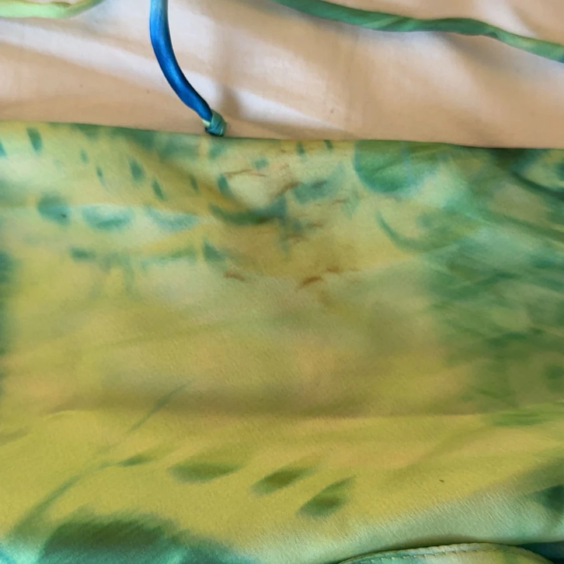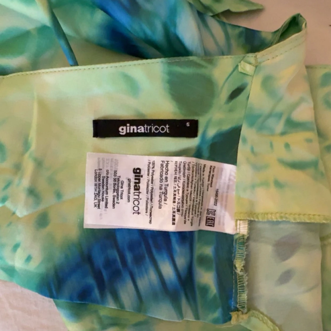 Säljer en snygg fest-topp från Gina Tricot i storlek S. Toppen har ett grönt och blått mönster, är croppad och knyts i nacken och ryggen. Perfekt för sommaren med sin ärmlösa och öppna rygg-design. Materialet är lätt och känns skönt mot huden. En defekt av smink fläck men på insidan så syns inte vid användning. Använd 1 gång på festival 🌵