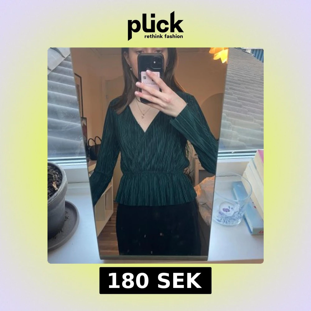 Snygg grön omlottblus med v-ringning och volangdetalj i midjan. Blusen har långa ärmar och en elegant passform som passar perfekt för både vardag och festliga tillfällen.