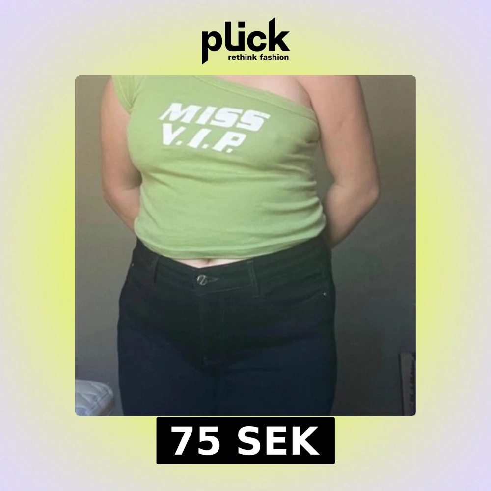 Snygg grön oneshoulder topp med texten 'MISS V.I.P.' i vitt. Toppen är en M men skulle nog passa bäst i en s-storlek, då trycket stretchas ut på mig.