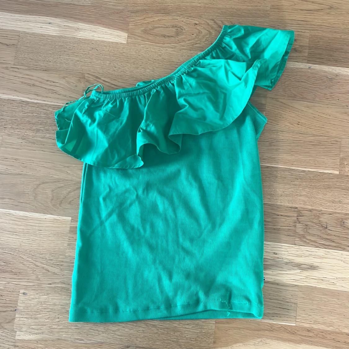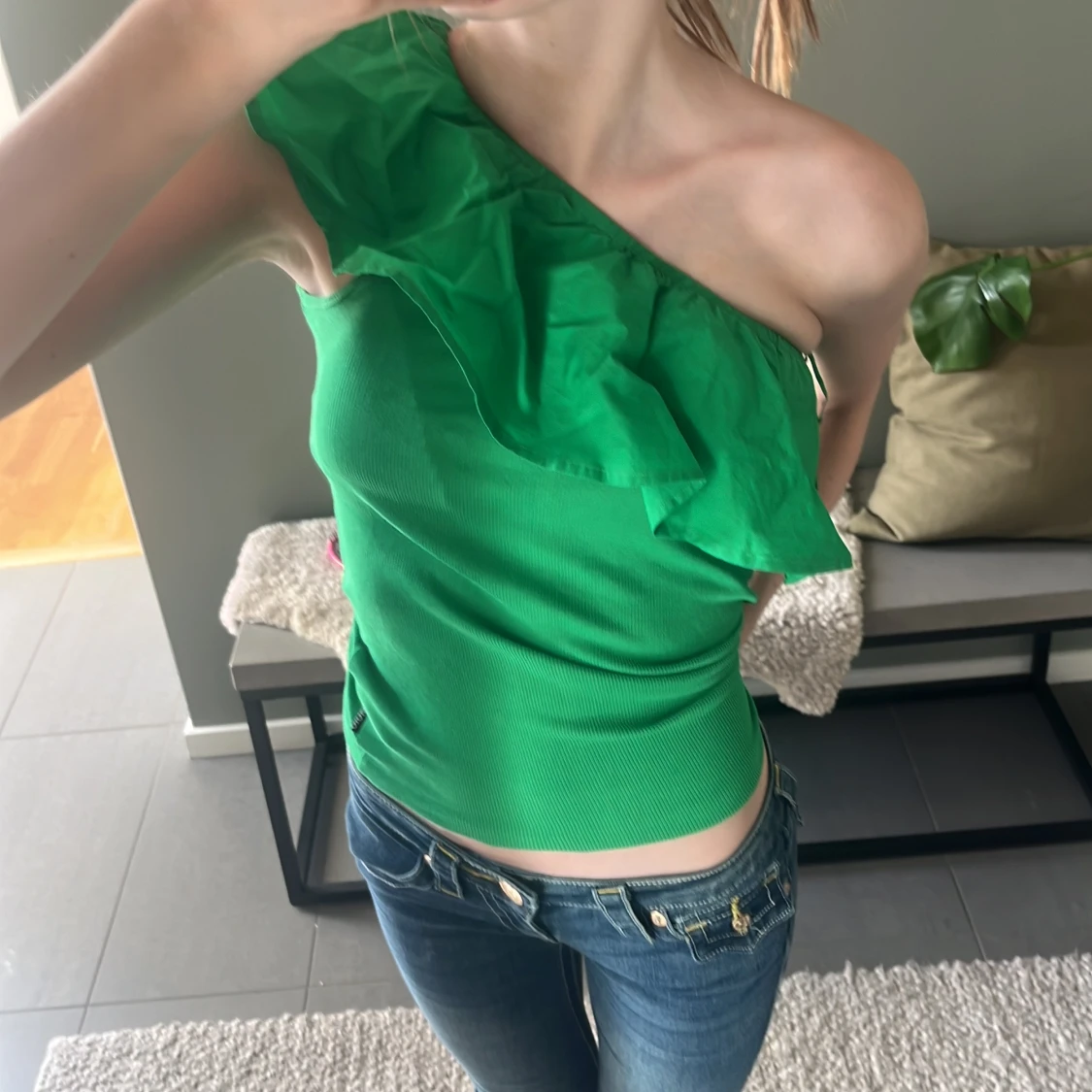 Snygg grön oneshoulder topp med stor volang längs halsringningen. Toppen är tight och ärmlös, perfekt för dig som vill sticka ut. Materialet är ribbat och stretchigt vilket gör den bekväm och följsam.