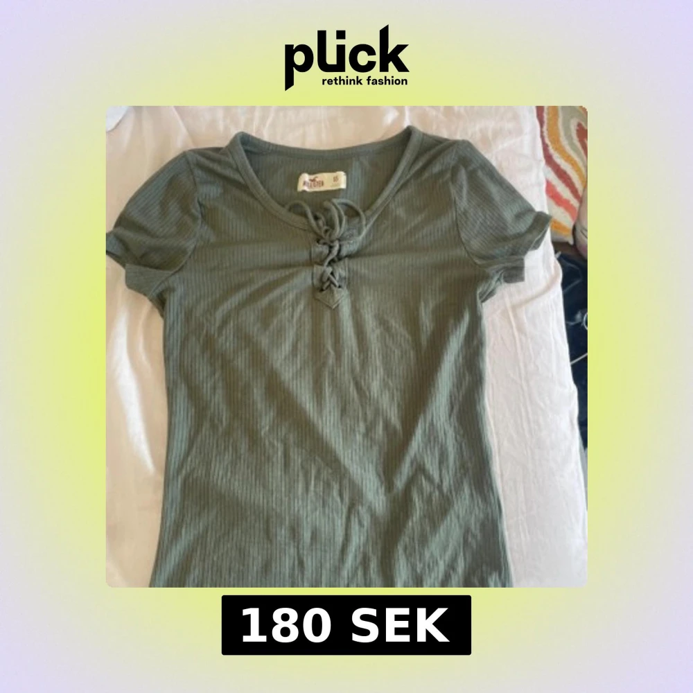 Snygg grön ribbad topp från Hollister i storlek XS. Modellen har korta ärmar och cool snörning framtill vid halsen. Materialet är mjukt och stretchigt, perfekt för en chill och trendig look. Passformen är normal och toppen har en lätt v-ringad hals.