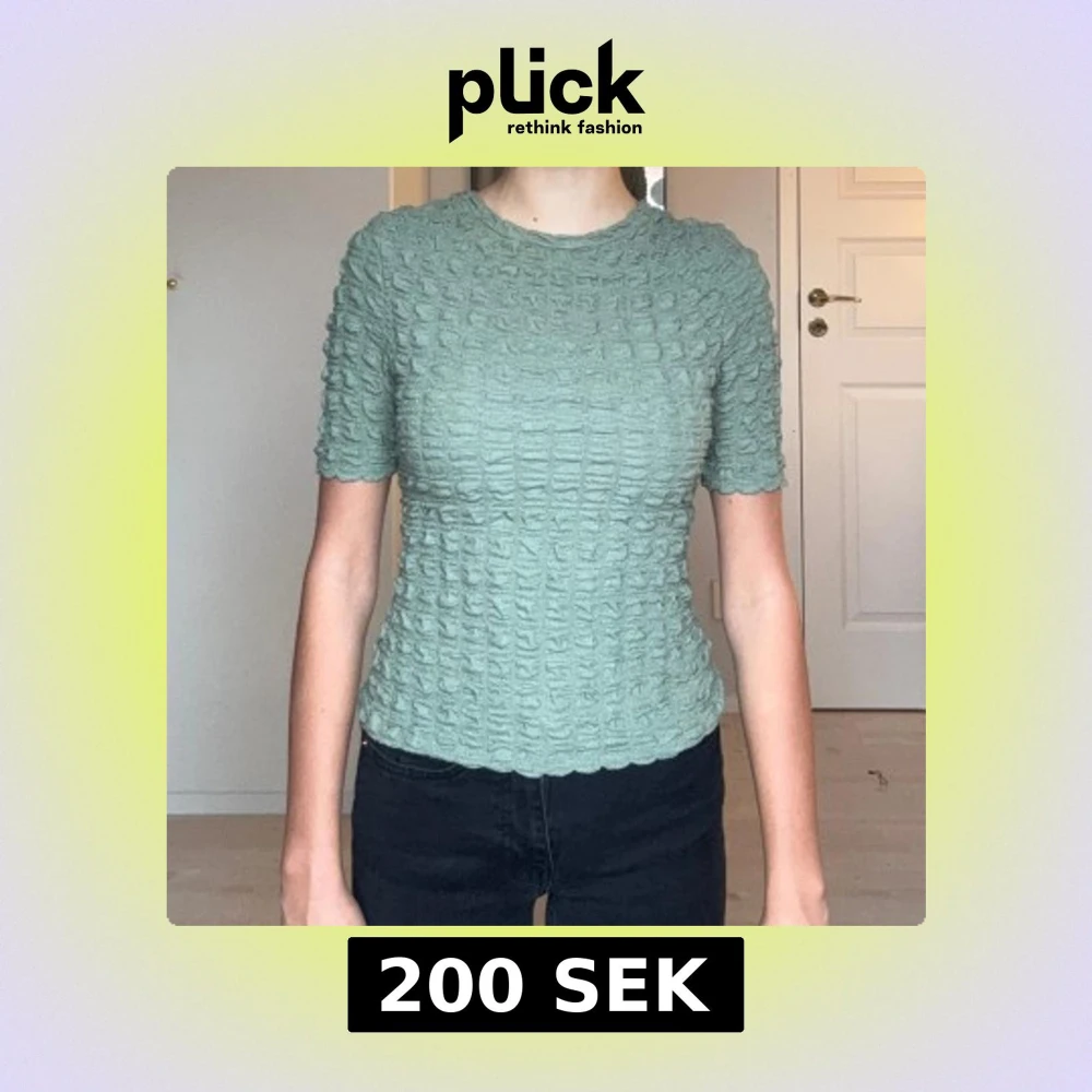 Säljer en ljusgrön topp med korta ärmar och rund hals. Toppen har ett ribbat, rutigt strukturmönster som ger en cool och unik look. Passformen är slim och materialet känns mjukt och stretchigt, perfekt till jeans eller kjol.