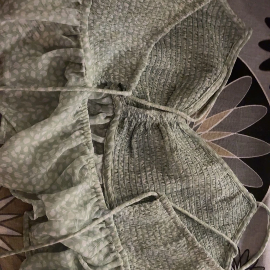 Söt grön ribbad topp med volangdetaljer och smala axelband från Gina Tricot. Perfekt för en somrig look med sitt lätta och luftiga material. Toppen har en smockad design som ger en bekväm passform.