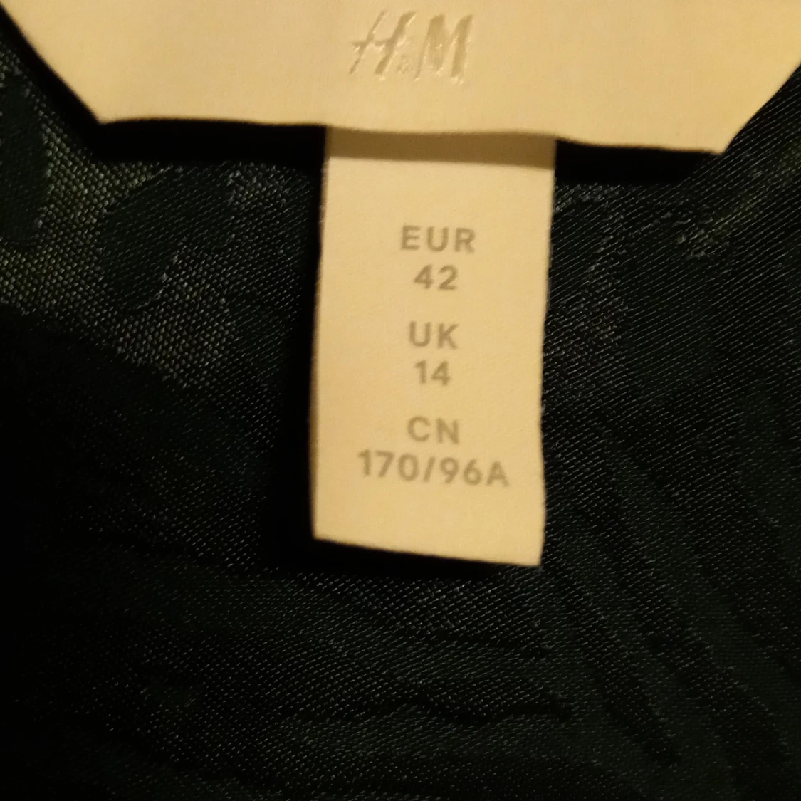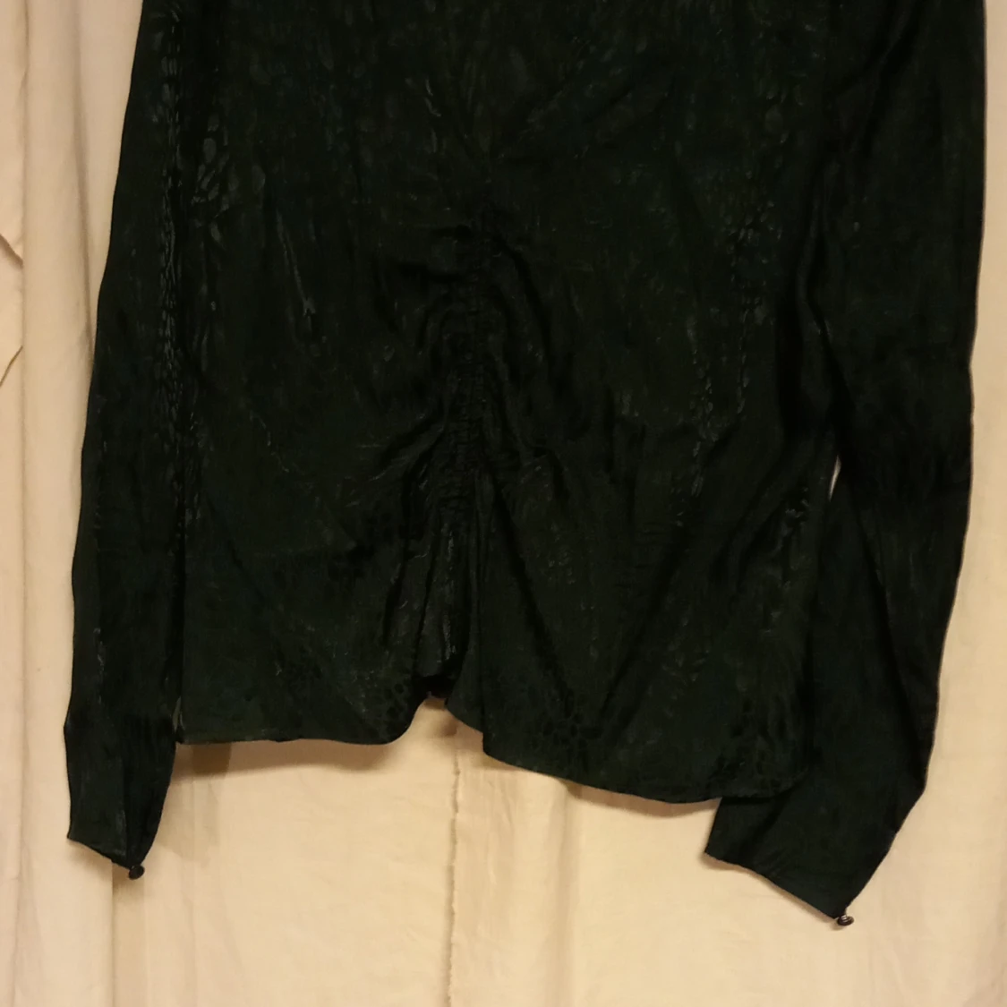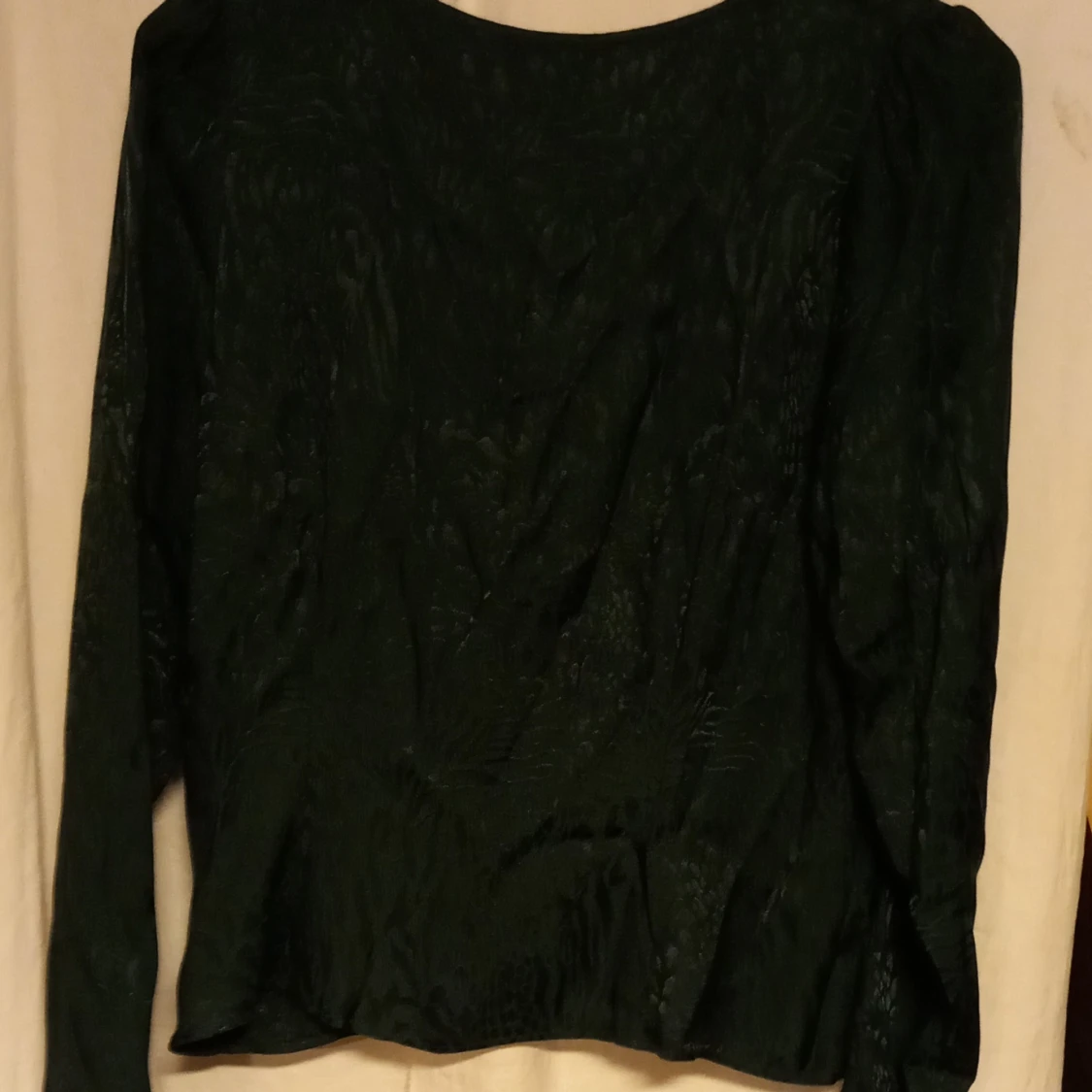 Säljer en elegant grön top från H&M med ett subtilt mönster. Blusen har långa ärmar och en lätt glansig yta som ger en lyxig känsla. Perfekt för att lyfta vilken outfit som helst.