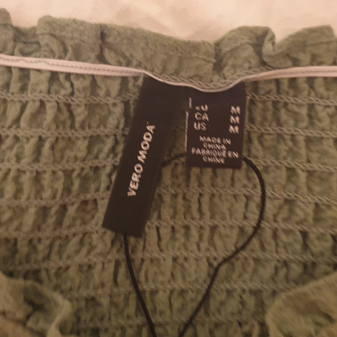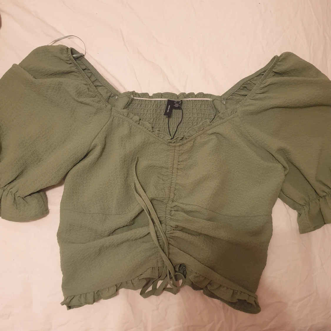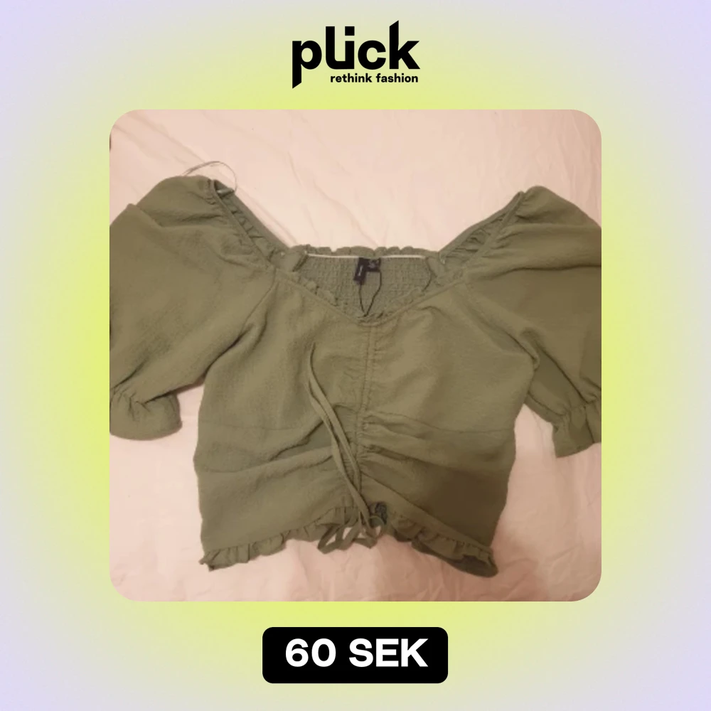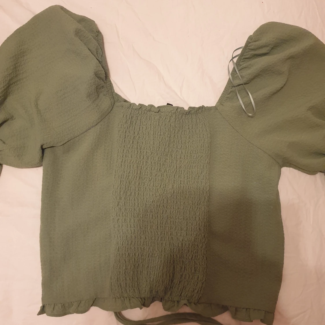 Söt grön topp med puffärmar och snörning i midjan. Toppen är i bra skick. Säljer för 60