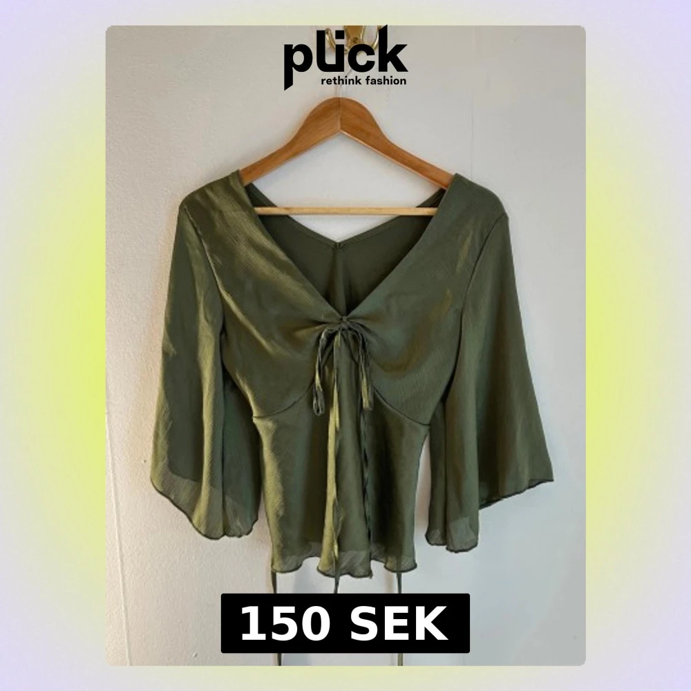Snygg olivgrön omlottopp med v-ringning och vida ärmar. Toppen har knytband både fram och bak för en justerbar passform. Tillverkad i ett tunt, ”satin” lätt material som ger ett flowy intryck. Perfekt för dig som gillar boho-vibbar och vill ha något unikt i garderoben.