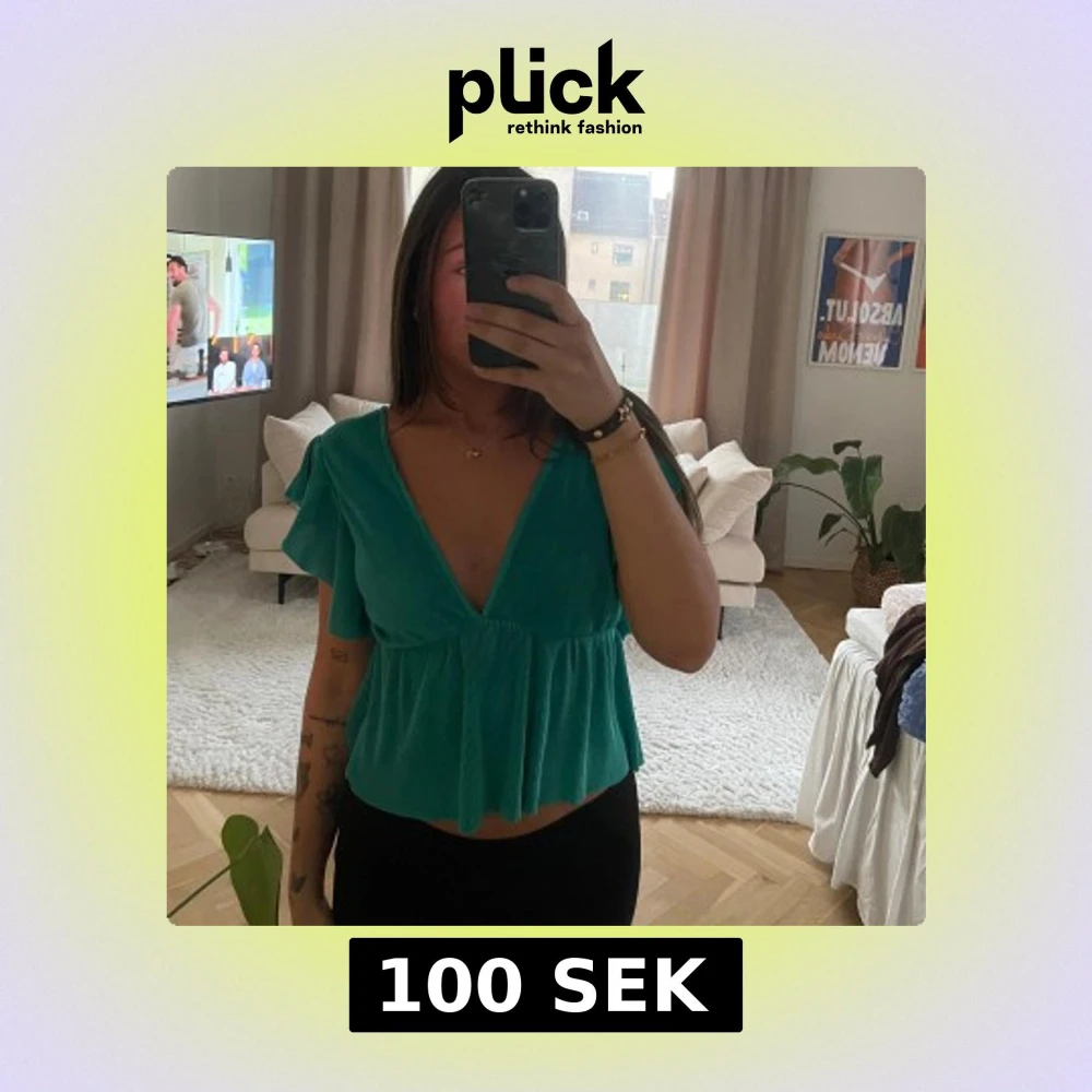 Säljer en snygg grön blus med v-ringning och volangdetaljer. Toppen är croppad och har korta ärmar, perfekt för en somrig look. Passar bra till både jeans och kjol.