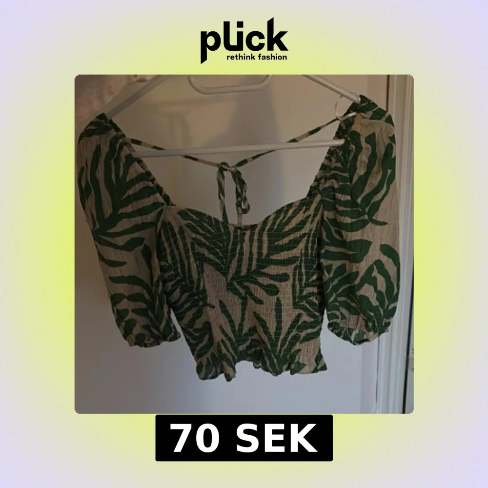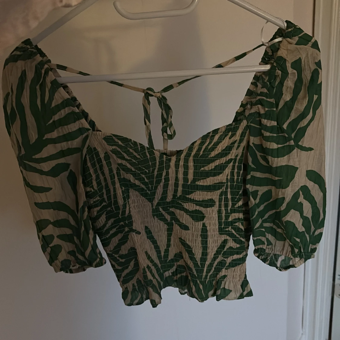 Säljer en croppad blus med grönt och beige zebramönster. Toppen har puffiga trekvartsärmar, smockad midja och knytning i ryggen.