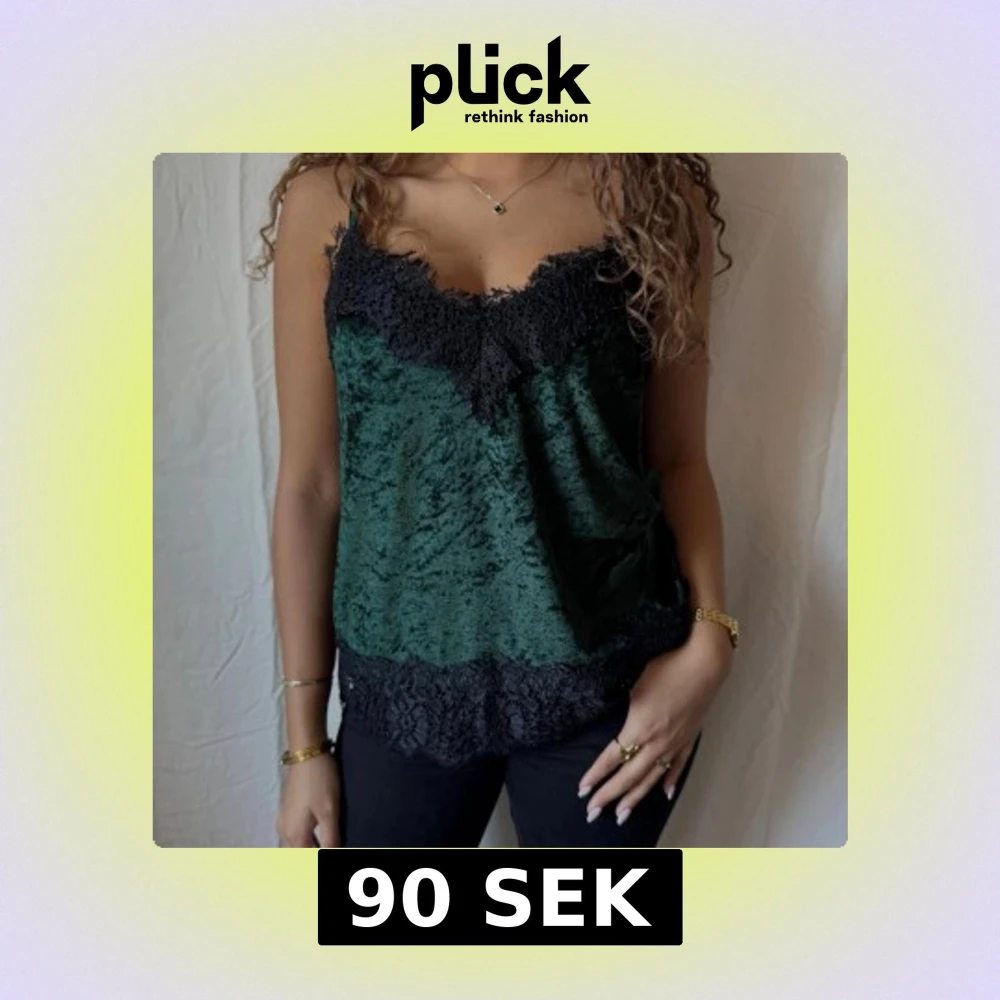 Mörkgrönt spetslinne i mjuk sammet med svarta spetsdetaljer längs urringning och nederkant. Tunt axelbandslinne med avslappnad passform, perfekt för att lyfta vilken outfit som helst.