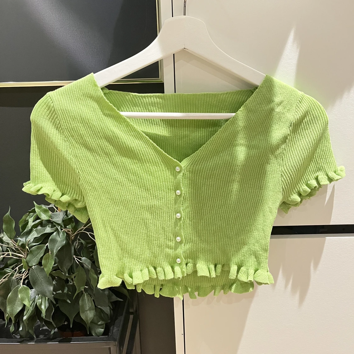 Fin grön topp med vita pärlor som knappar. Strl: S Skick: bra skick, aldrig använd.