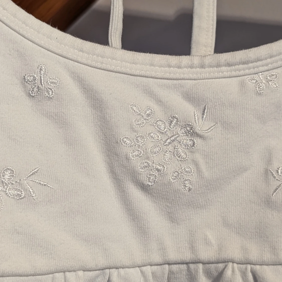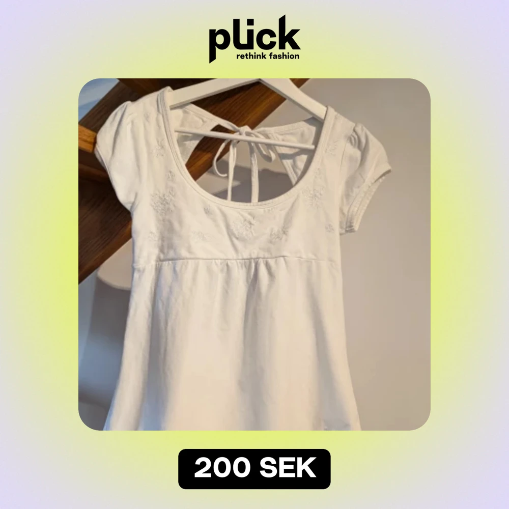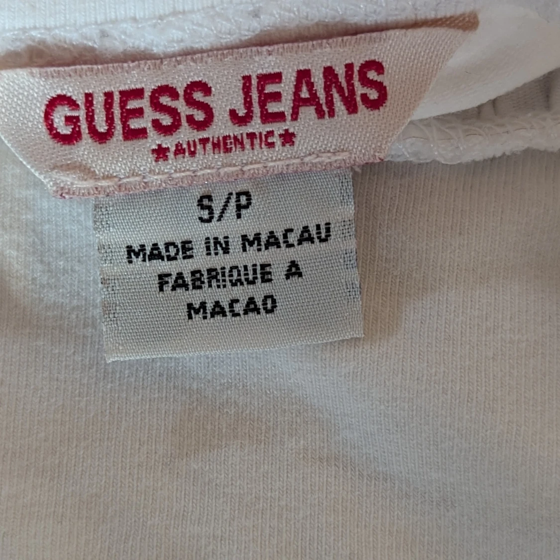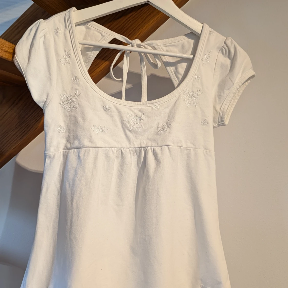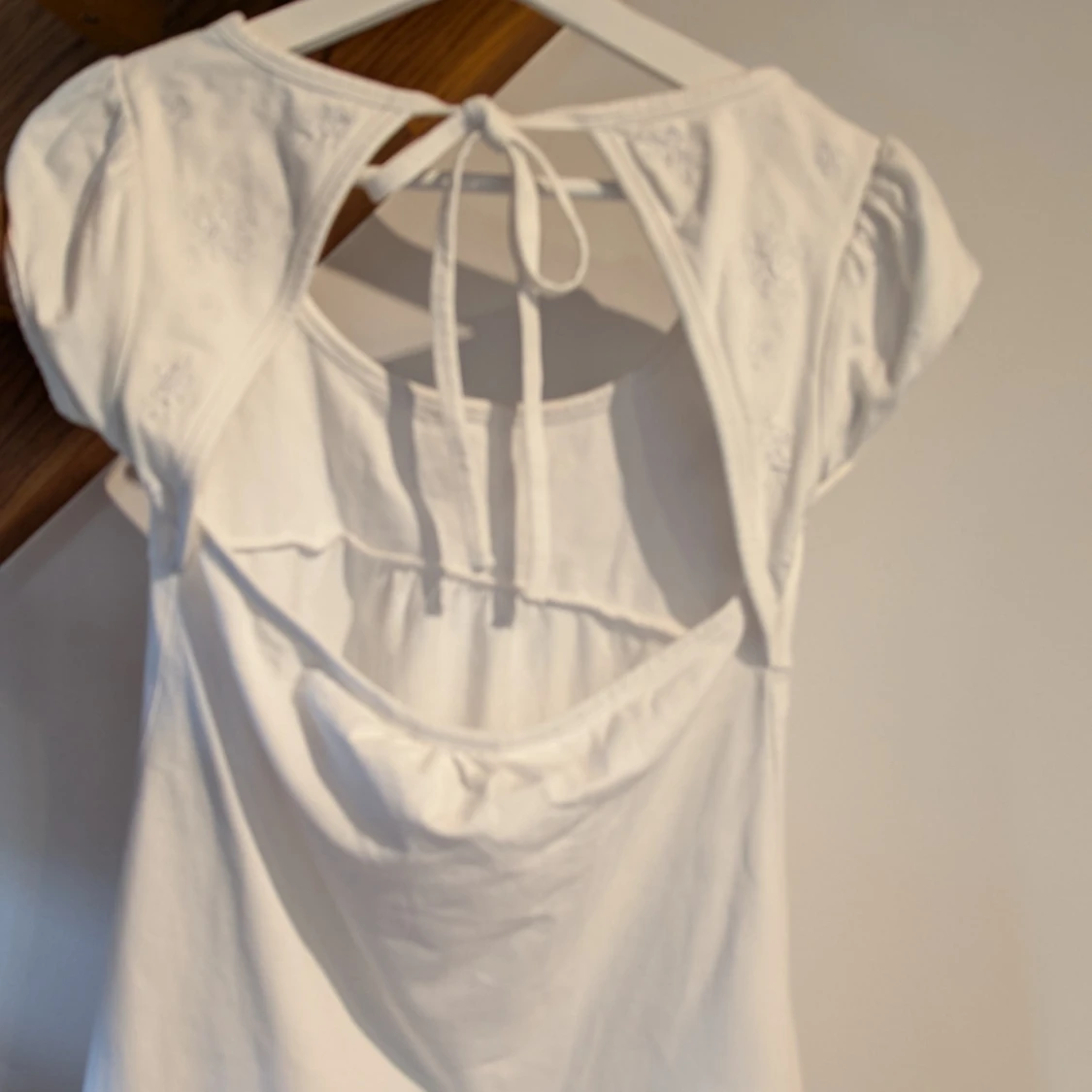 Söt vit bomullstopp från Guess, strl S. Kort ärm. Delvis öppen rygg/lågt skuren i ryggen med band som knyts i nacken. Vit brodyr på övre delen. Mkt fint skick.