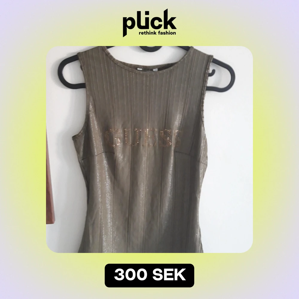 Snygg glittrig topp från Guess (strl S) i en metallisk grön-brun nyans. Den är ärmlös och har ett ribbat mönster med Guess-loggan i glittriga stenar på framsidan. Perfekt för en festlig kväll eller en utekväll med vänner. Toppen är stretchig och framhäver figuren.