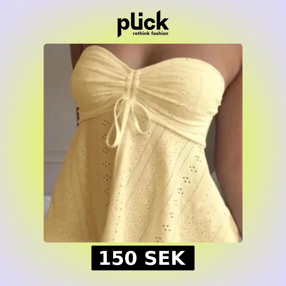 Supersöt gul axelbandslös topp med knyt framtill och broderade hålmönster. Lätt och luftig modell som ger sommarkänsla, perfekt för varma dagar.