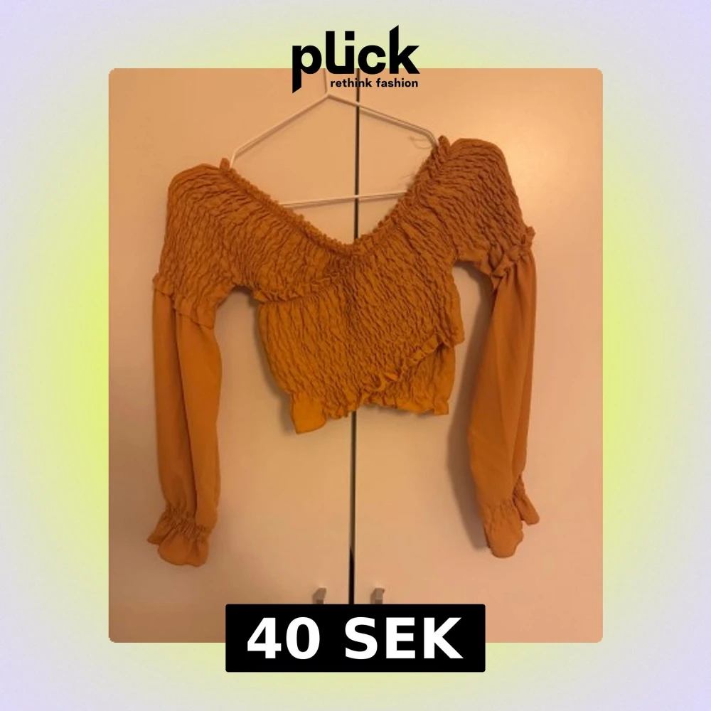 Trendig gul blus med smockad överdel och långa ärmar. Offshoulder-modell med volangdetaljer och croppad passform. Perfekt för dig som vill sticka ut med en färgglad och unik topp.