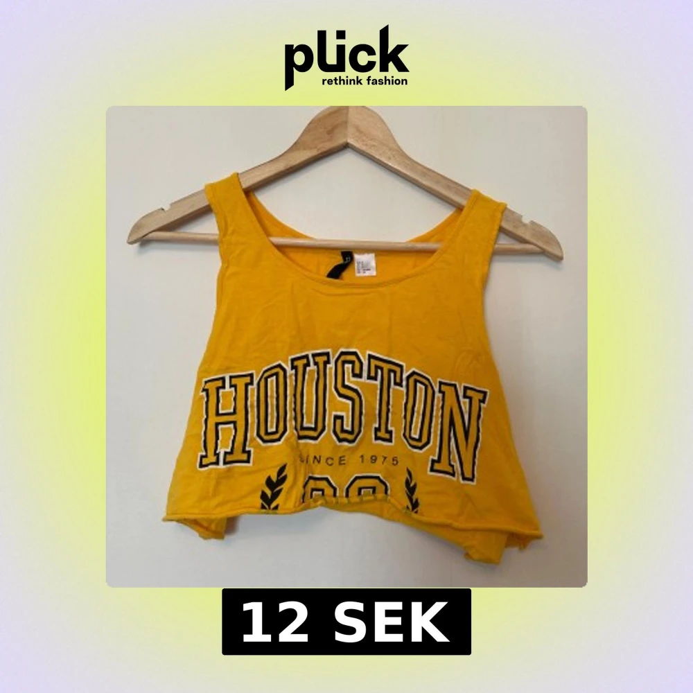 Säljer en gul croppad linnetopp från H&M med text tryckt på framsidan. Toppen är ärmlös och har en rund halsringning.