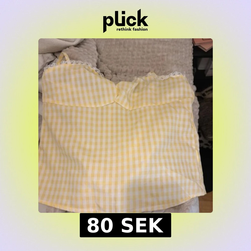 Säljer en söt linnetopp i gul och vit rutig design med tunna axelband och spetsdetaljer vid halsringningen. Toppen har en mjuk, feminin form och är perfekt för varma dagar. Passar dig som gillar ljusa färger och romantisk stil.