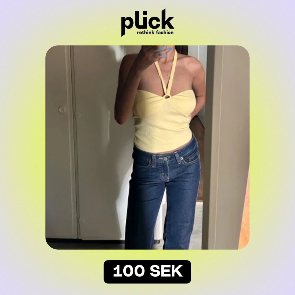 Säljer en ljusgul halterneck-top med en elegant metallring som pryder bröstet och ger en sofistikerad touch. Denna topp är perfekt för sommardagar eller utekvällar och sitter skönt på kroppen tack vare stretchiga materialet som också framhäver midjan
