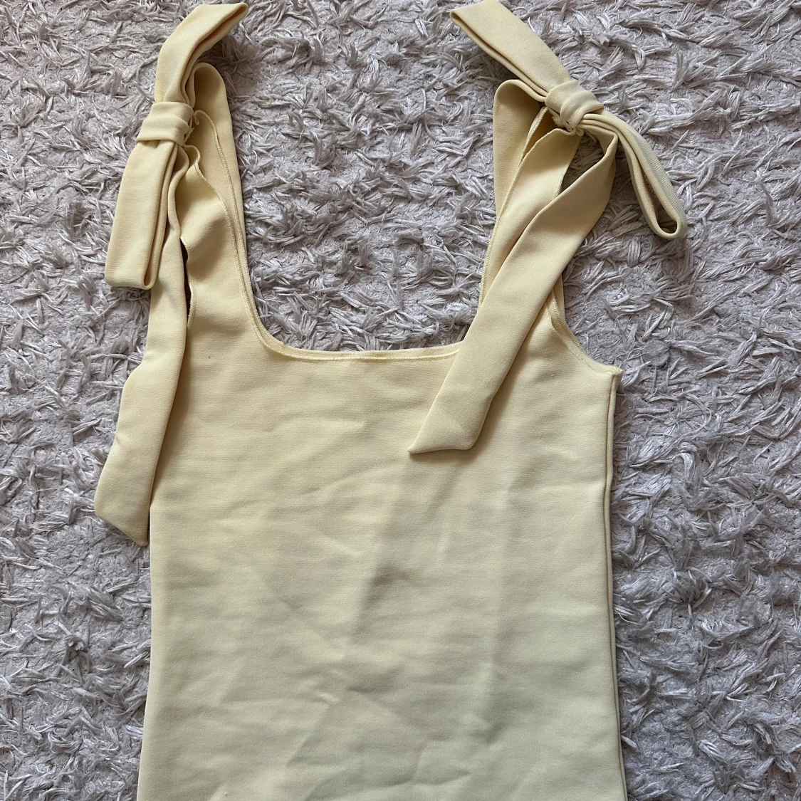 Supersöt ljusgul linnetopp från Zara med breda axelband som knyts i rosetter. Toppen har rak halsringning och är figurnära i modellen. Perfekt för dig som gillar en enkel men ändå trendig look. Materialet är mjukt och stretchigt för extra komfort. Använd 1 gång!! Pris diskuteras vid snabb affär 💕💕