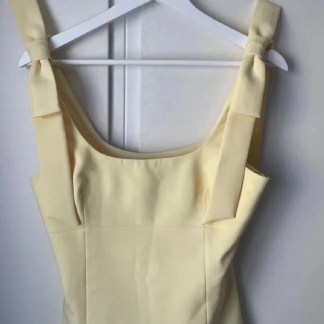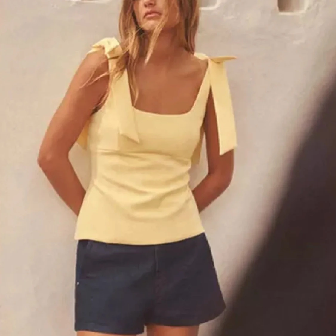 Supersöt ljusgul linnetopp med breda axelband och fina rosetter på axlarna. Toppen har en fyrkantig ringning och figurnära passform som ger en fräsch och somrig vibe. Perfekt att matcha med shorts eller kjol för en chill look.