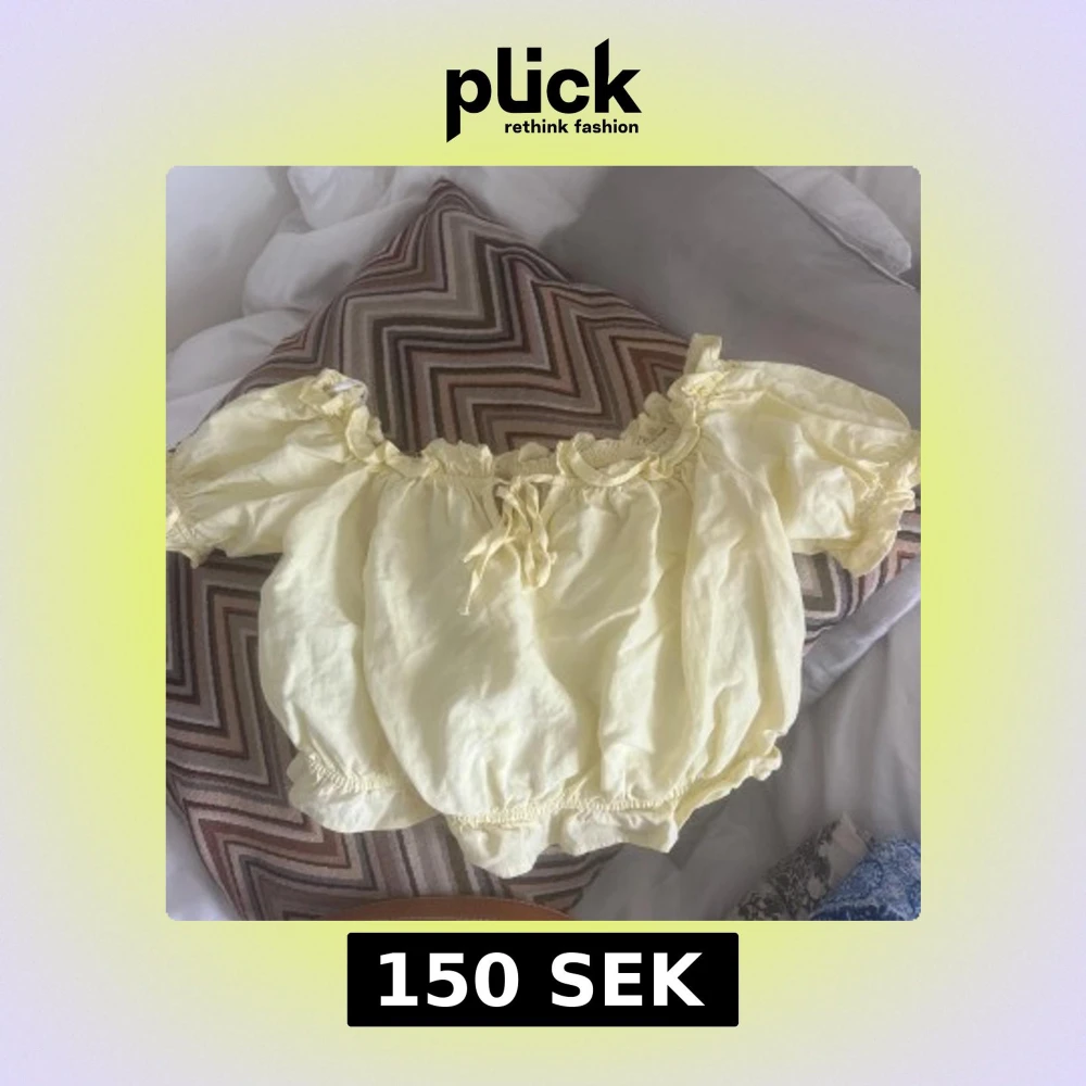 Supersöt ljusgul blus med offshoulder och puffiga korta ärmar. Toppen har volangdetaljer och knytning framtill, samt resår vid ärmslut och nederkant för en ballongig look. Perfekt för en somrig vibe!