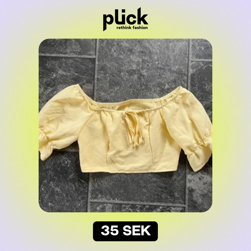 Säljer en superfin gul offshoulder topp med korta puffärmar och knytning framtill. Perfekt för sommardagar och ger en söt och romantisk look. Toppen är croppad och gjord i ett lätt och bekvämt material.
