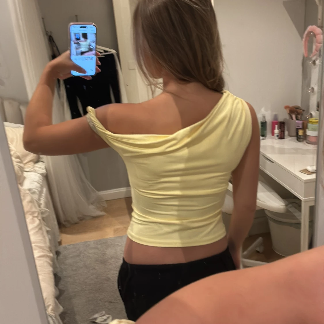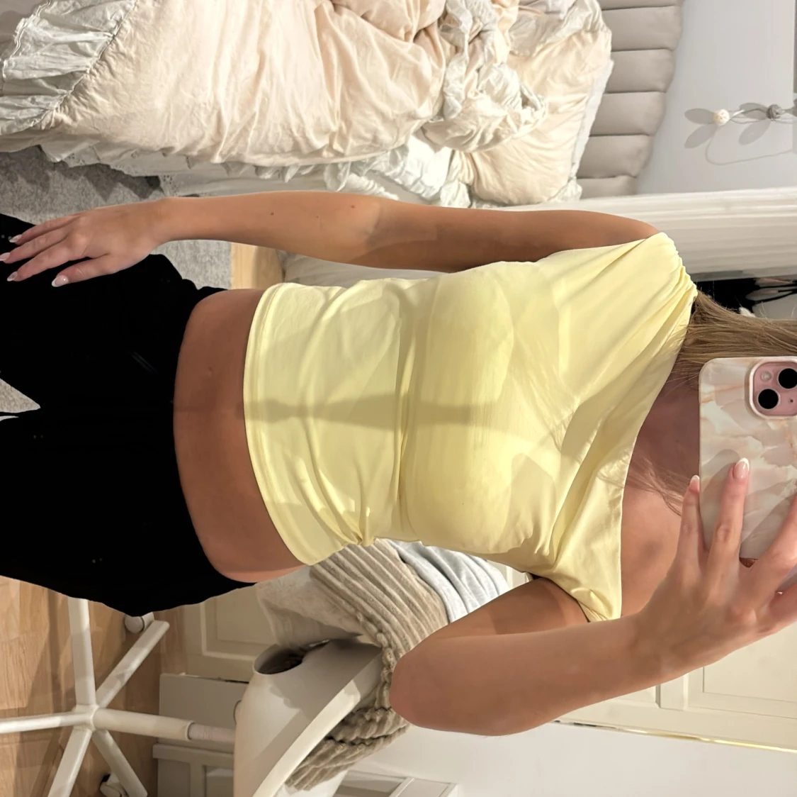 Säljer en ljusgul, croppad topp med one shoulder-design. Toppen är tight och har en snygg drapering över axeln. Tillverkad i mjukt och stretchigt material.