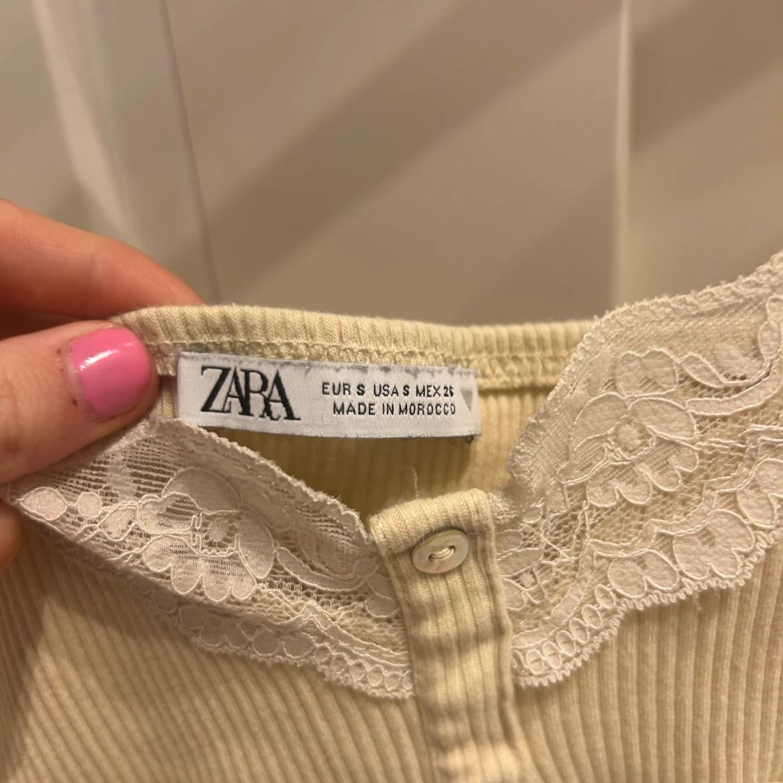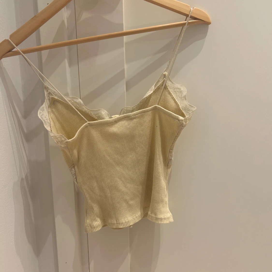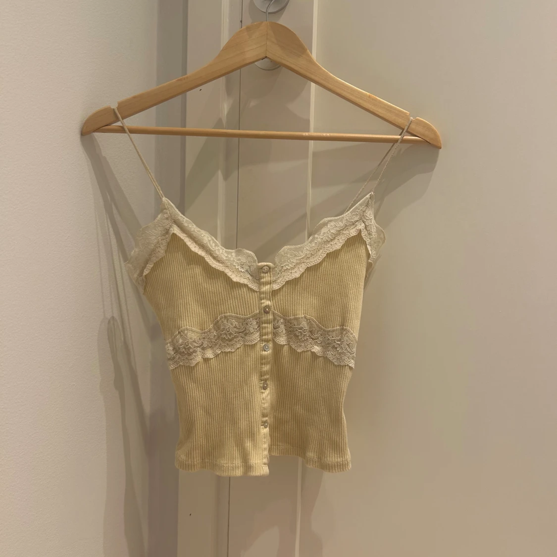 Supersöt gul linnetopp från Zara med smala axelband och ribbad struktur. Toppen har spetsdetaljer i vitt längs halsringningen och mitt på, samt knappar framtill. Perfekt för sommarens alla tillfällen, riktigt trendig och feminin vibe.