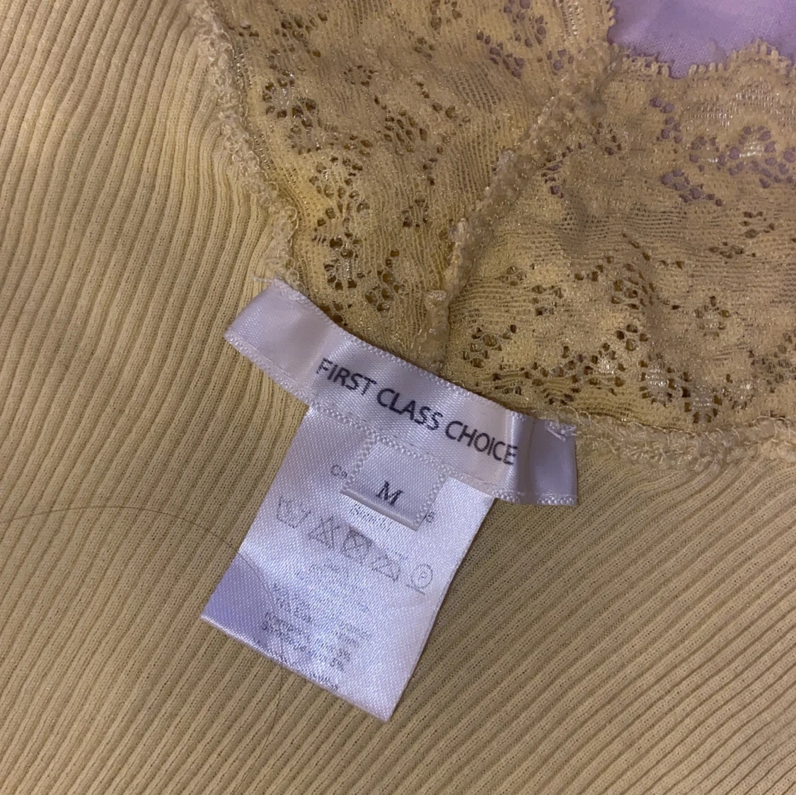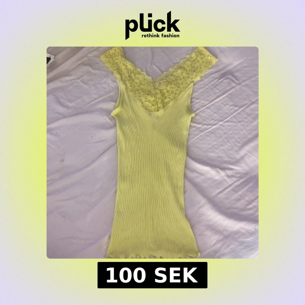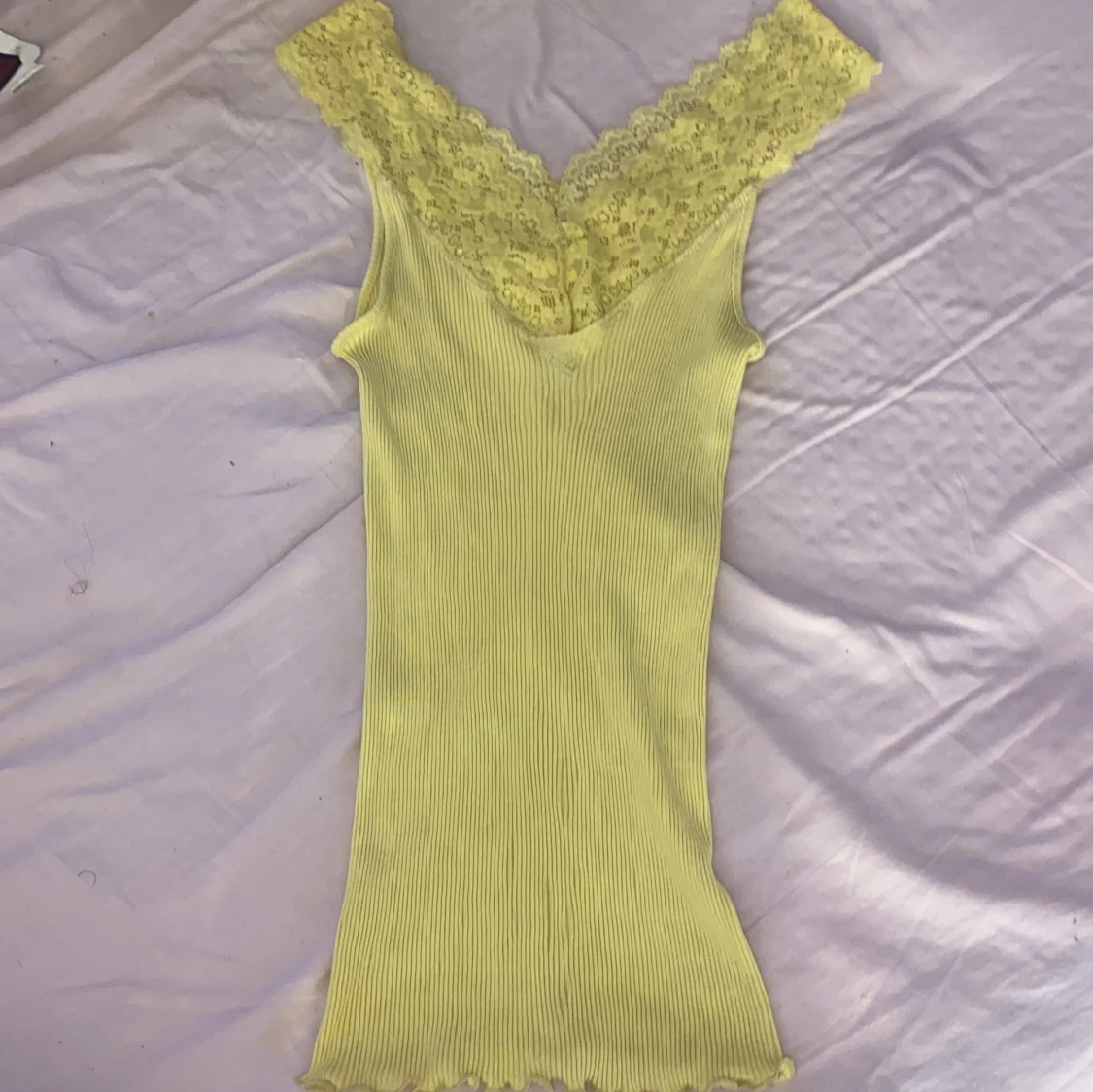 Säljer en söt gul ribbad topp med vacker spetsdetalj vid halsringningen. Toppen har en v-ringad design och är perfekt för varmare dagar. Den är både stilren och bekväm. Den sitter tajt på och är lite längre topp. Jag har storlek XS i linnen och denna sitter perfekt även om de är storlek M