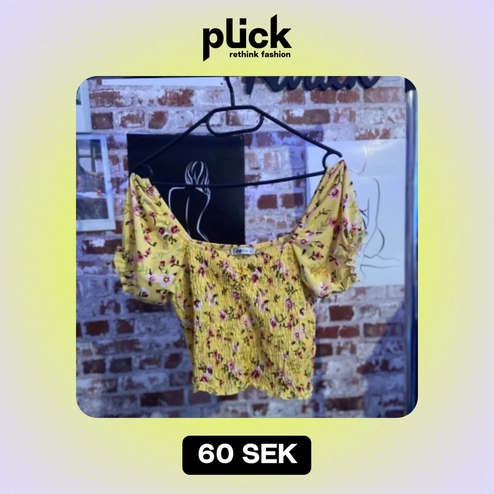 Säljer en superfin gul topp från FB Sister med blommigt mönster i rosa och grönt. Toppen har korta ärmar med volangdetaljer och en smockad, croppad passform. Perfekt för sommardagar eller en festlig kväll!