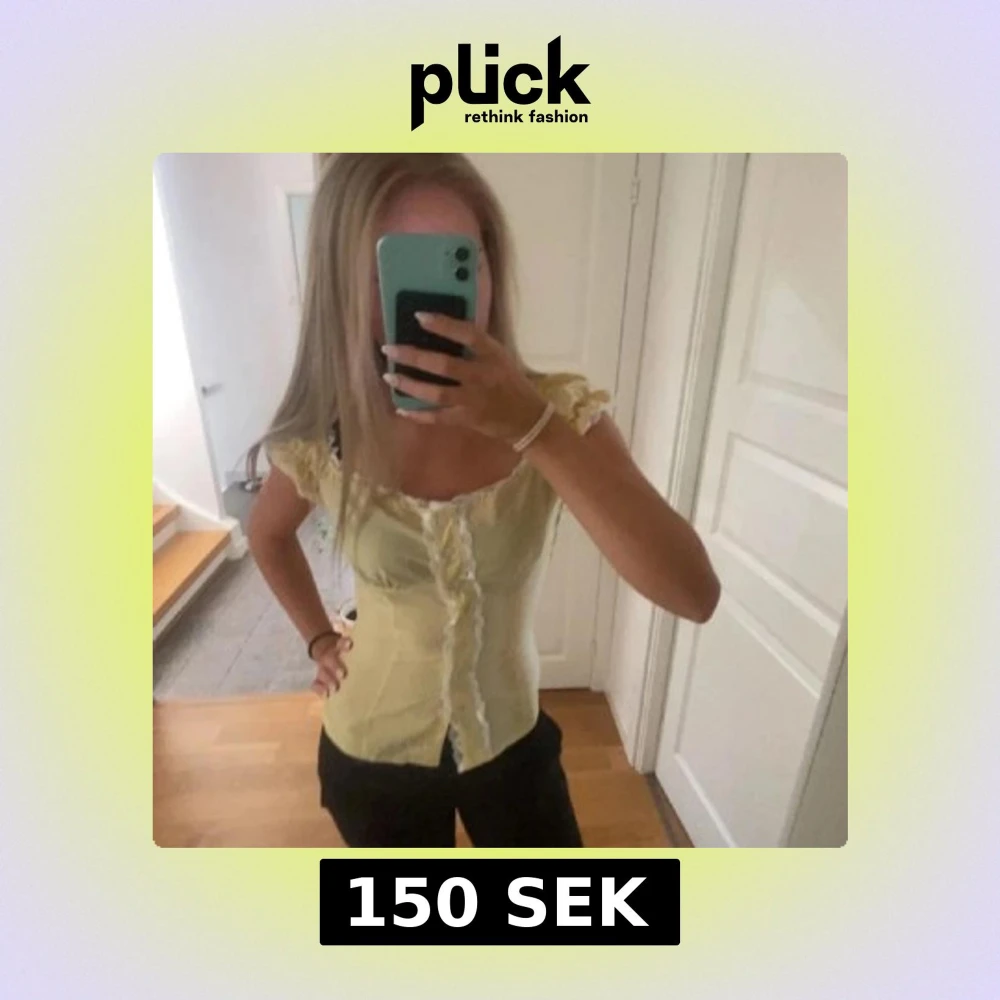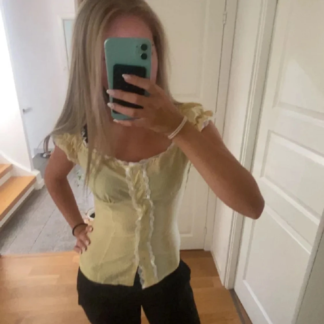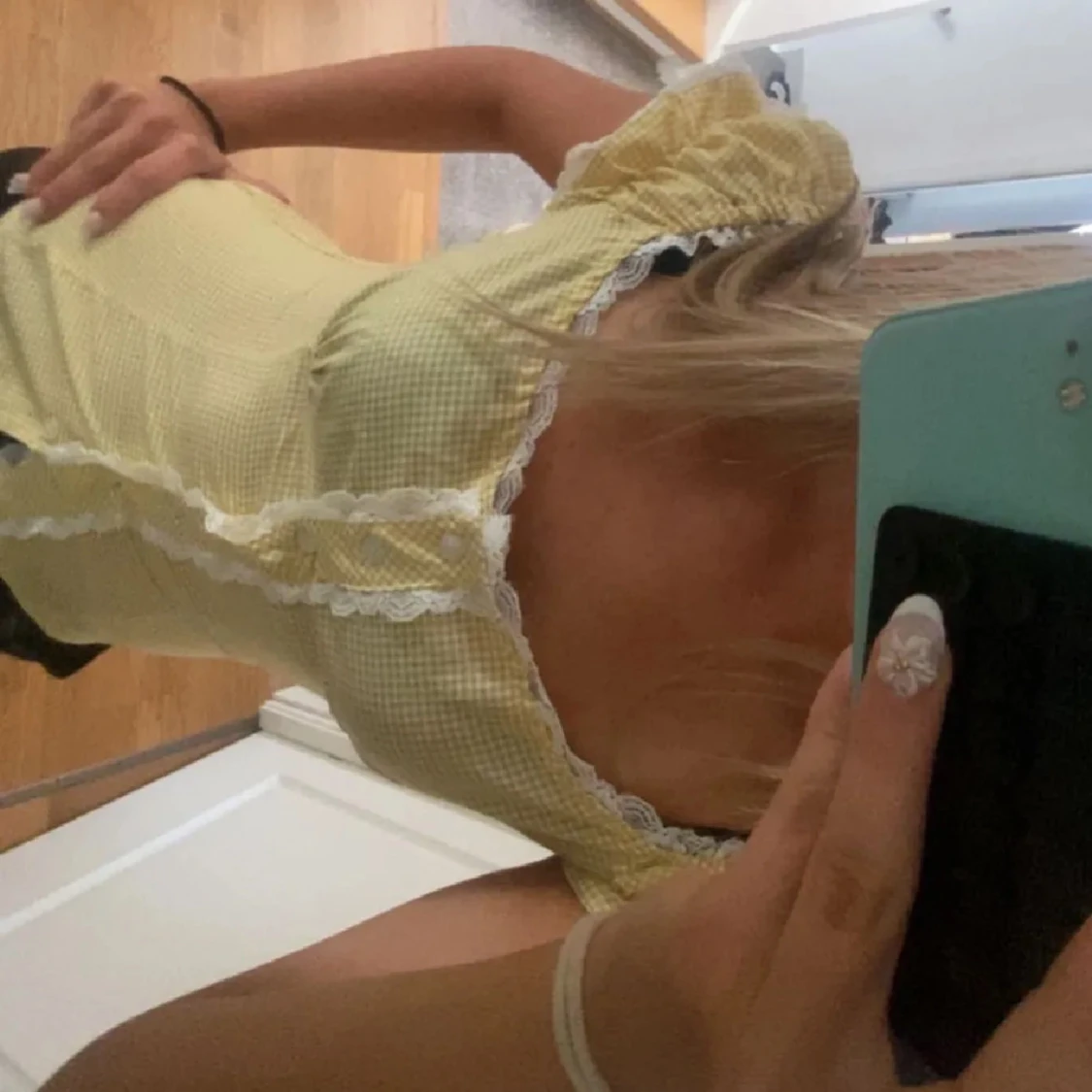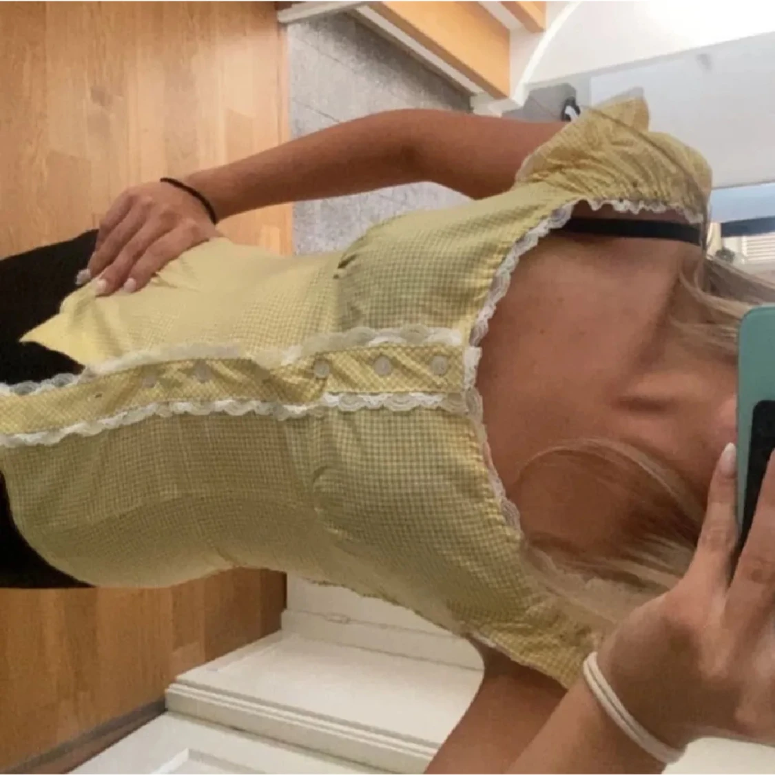 Supersöt gul blus med små rutiga mönster och vita spetsdetaljer. Köpt på plick men passade inte, aldrig använd av mig. Inte mina bilder! 🥰🥰