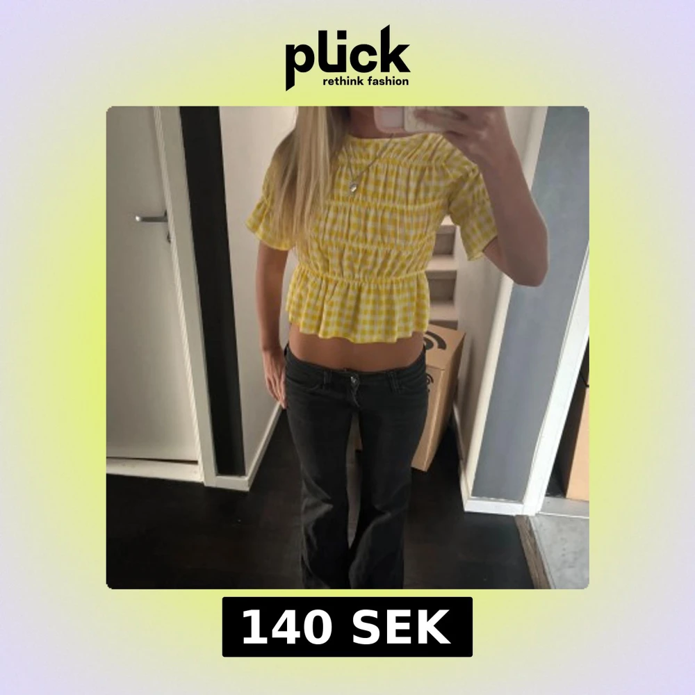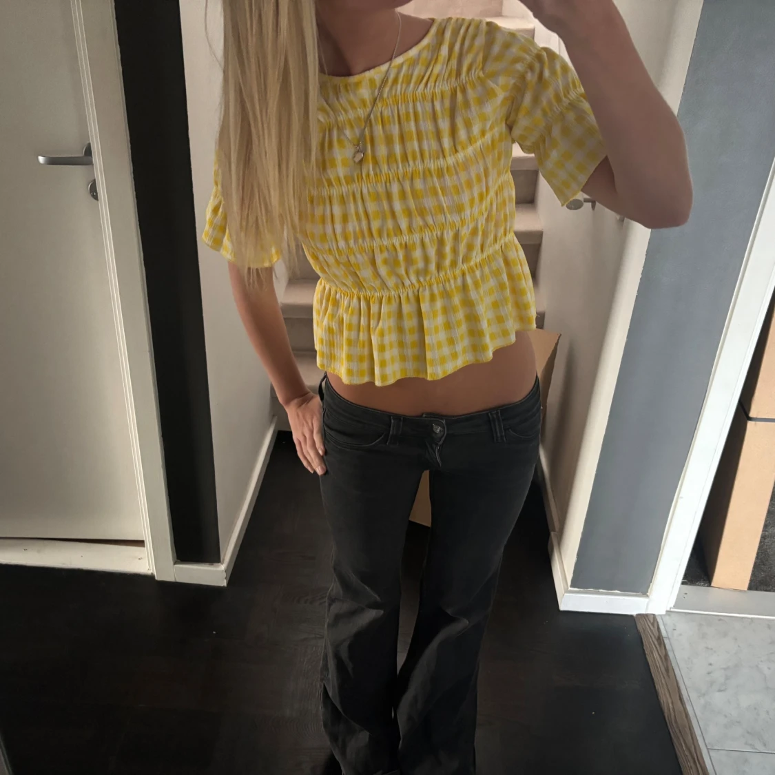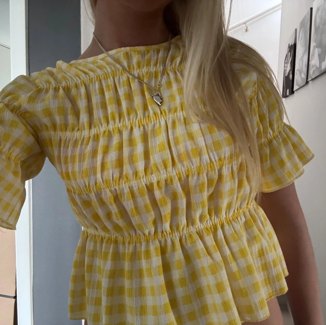 Säljer en söt gul och vit rutig blus med korta ärmar och volang nedtill.