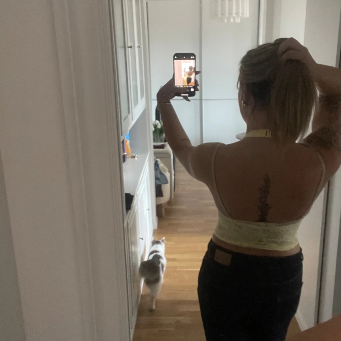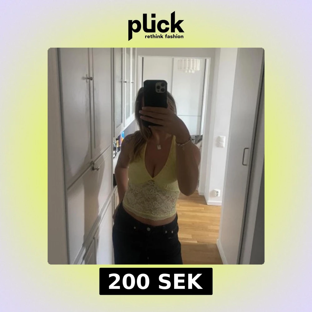Säljer en ljusgul croppad linnetopp med spetsdetaljer och v-ringad hals. Toppen har smala axelband och är tillverkad i ett mjukt, transparent spetsmaterial som ger en fräsch och somrig vibe. Perfekt för dig som gillar att sticka ut med färg och detaljer.