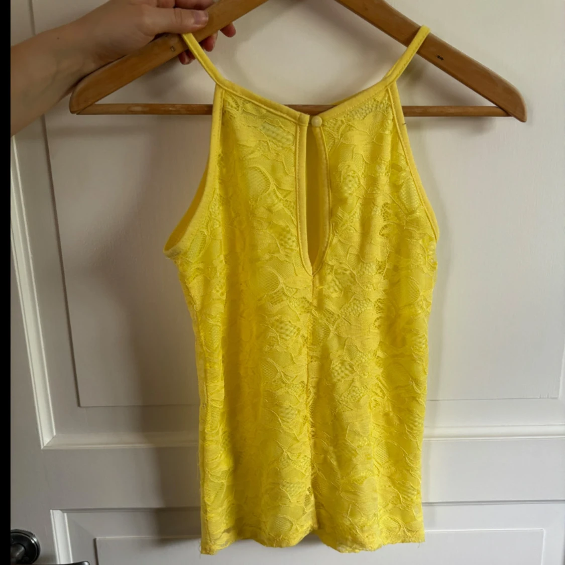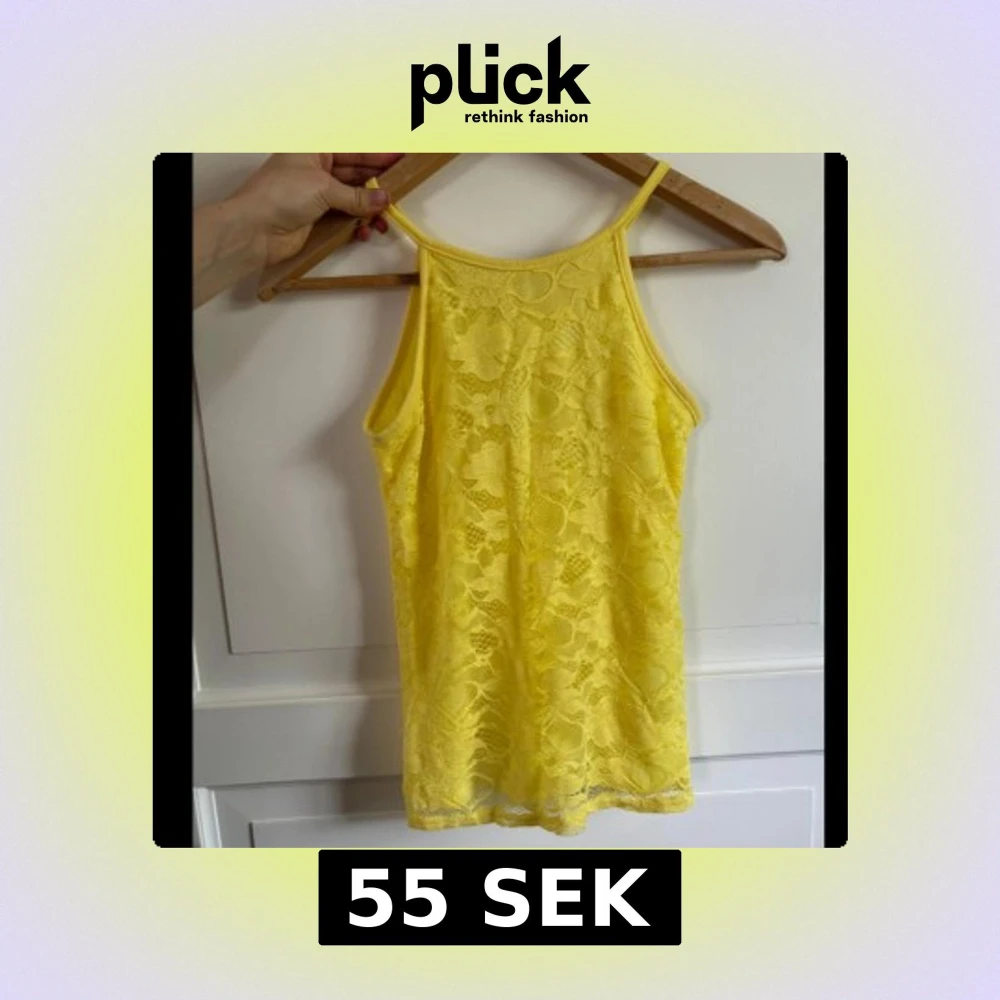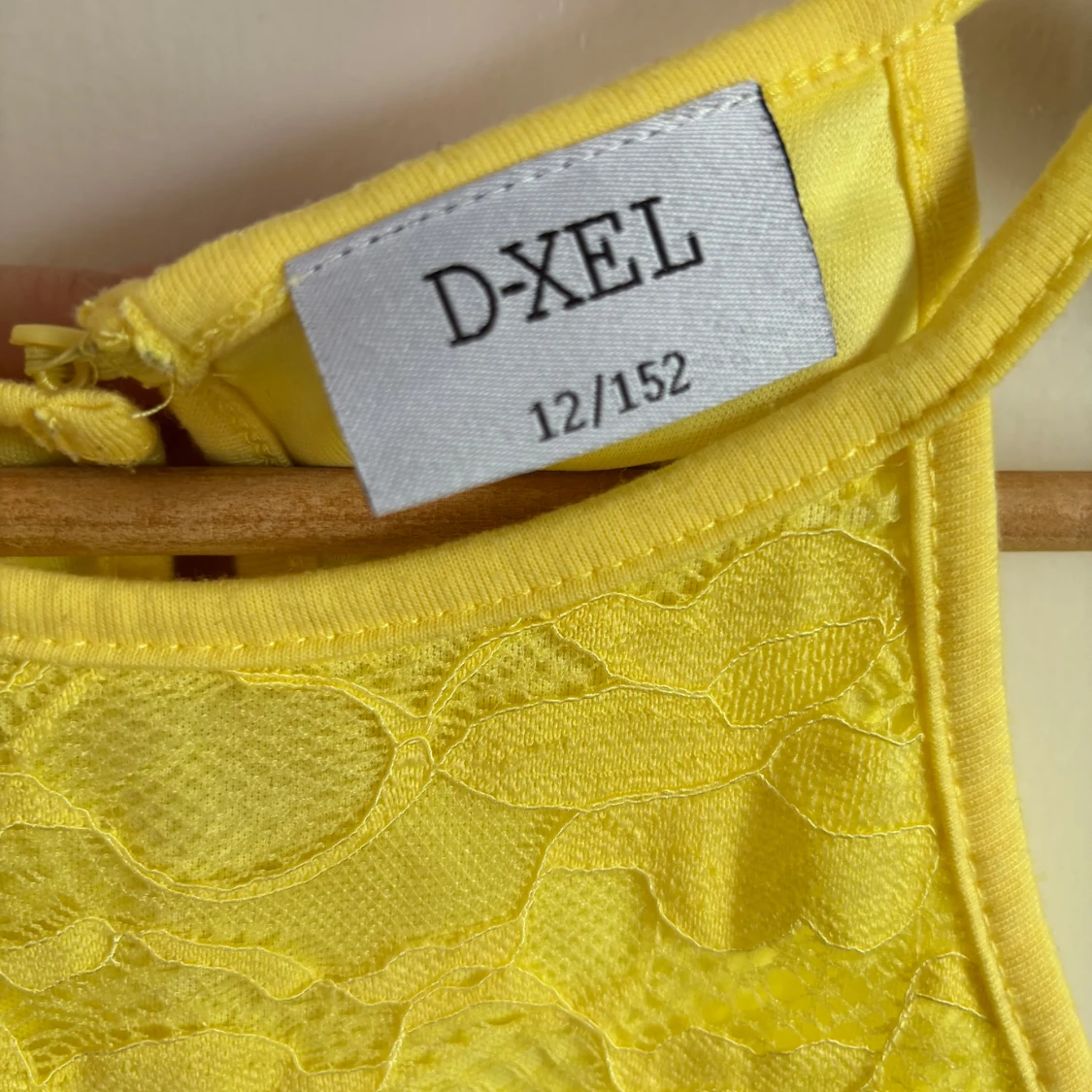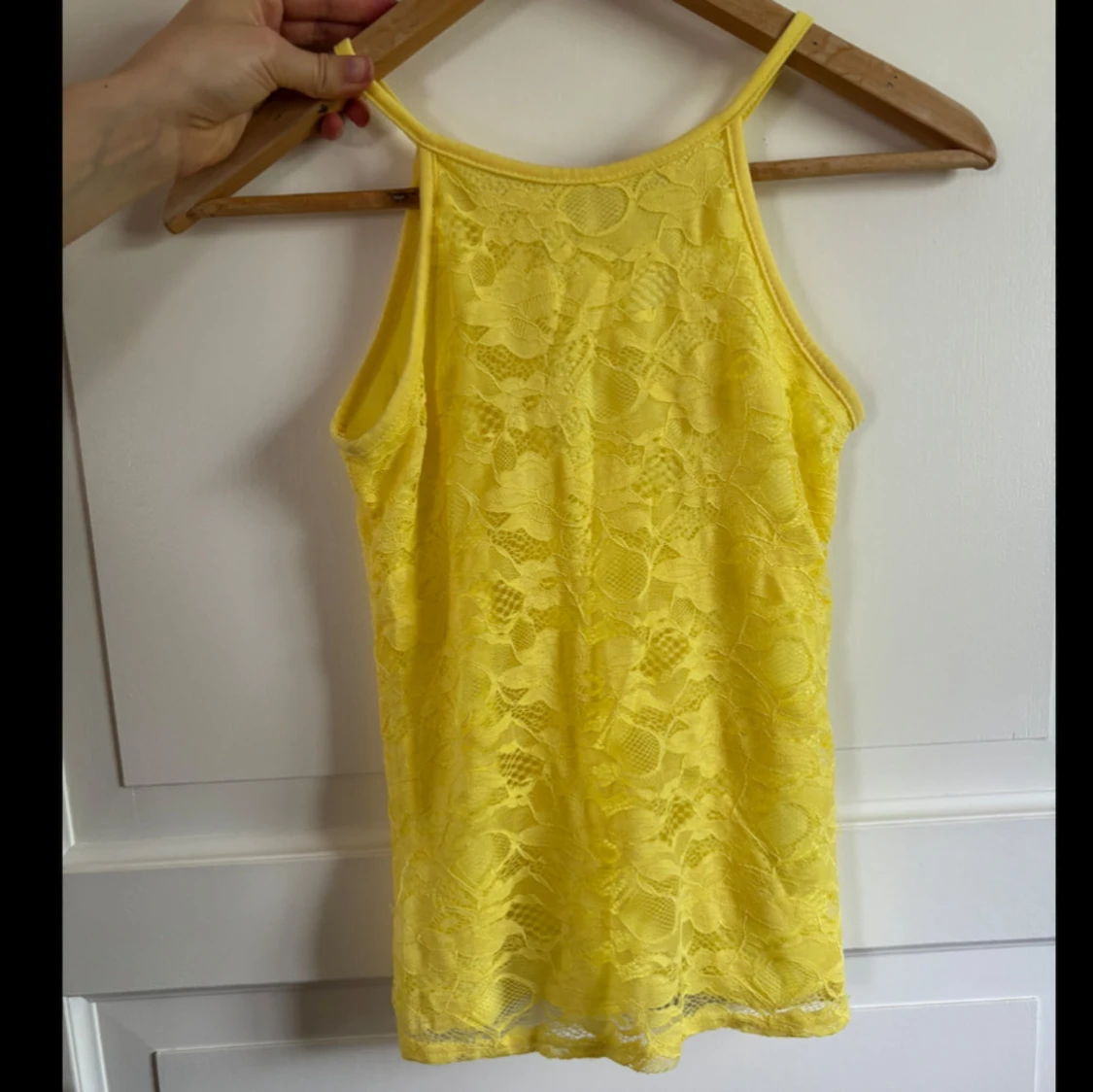 Superfin gul linnetopp från D-XEL med smala axelband och helspets över hela toppen. Toppen har en liten knapp i nacken och är ärmlös med en rak passform. Perfekt för dig som vill sticka ut med en färgglad och somrig look!