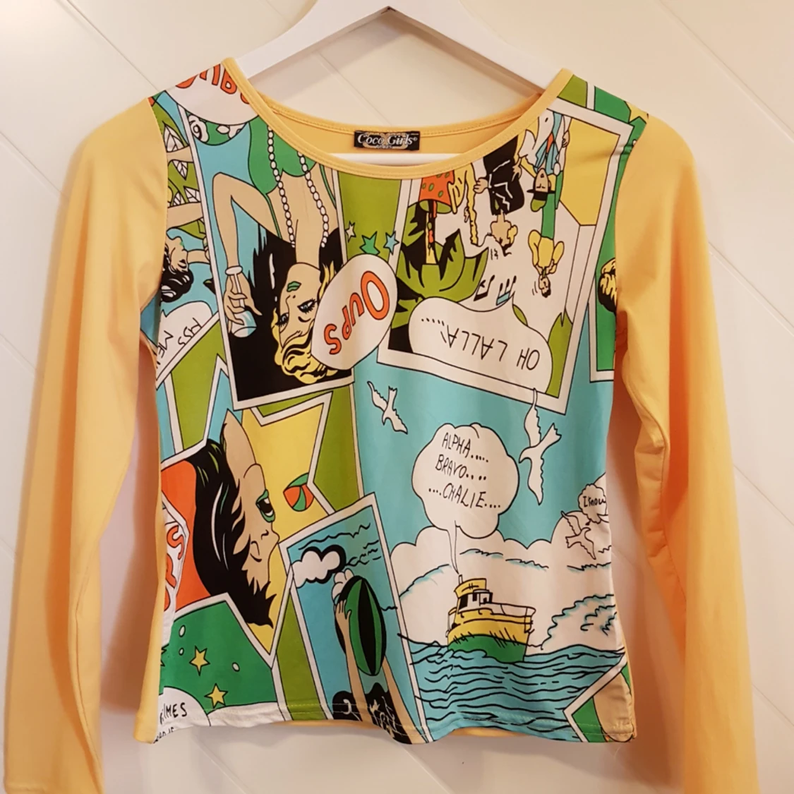 Jättefin, annorlunda tröja från Coco girls. Står ingen storlek men är gissningsvis strlk S. Tryck på framsida i serietidningsstuk med gula ärmar och rygg. Knappt använd. Frakt tillkommer