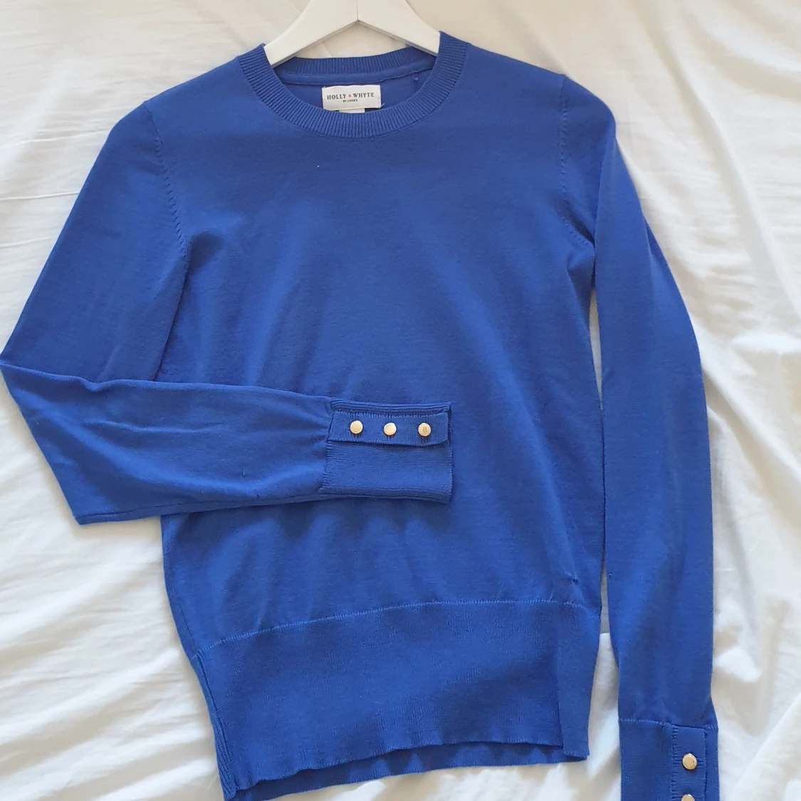 En jettefin blå långärmad tröja ifrån lindex. Använd fåtal gånger. Har gulddetaljer vid armslutet💕