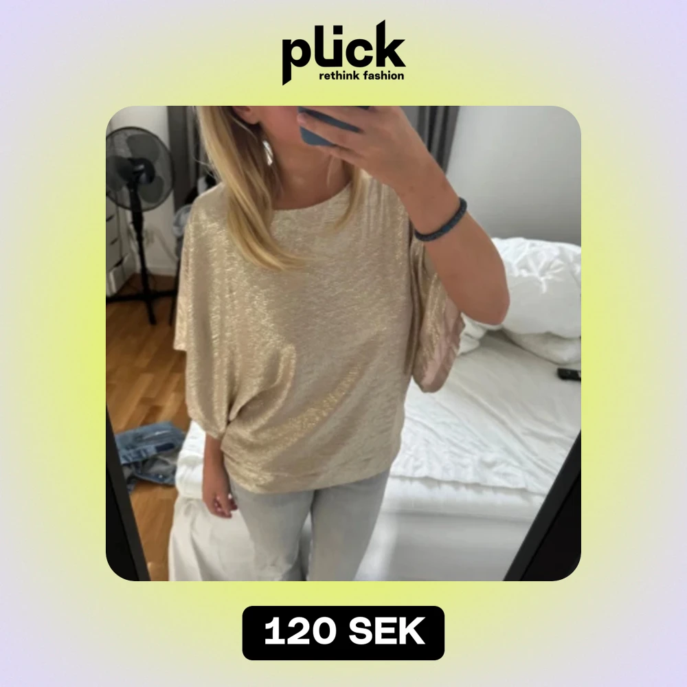 Säljer en snygg guldig glittrig topp i storlek M. Toppen har en loose passform och korta ärmar, perfekt för festliga tillfällen. Materialet är mjukt och bekvämt, och den glittriga ytan gör att du sticker ut i mängden. Perfekt för en utekväll eller en speciell fest!