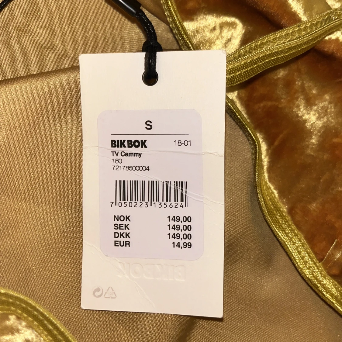 Supersnygg guldig body i sammet från Bik Bok med smala axelband och v-ringning. Perfekt för dig som vill sticka ut med en glansig och lyxig look. Säljs med prislapp kvar!