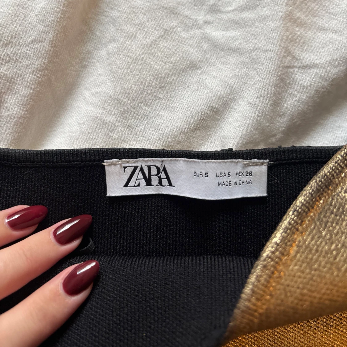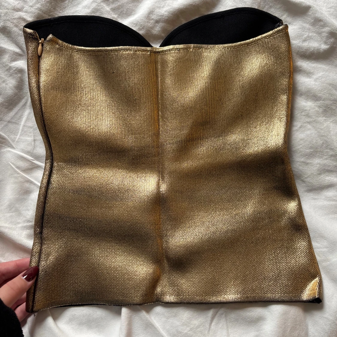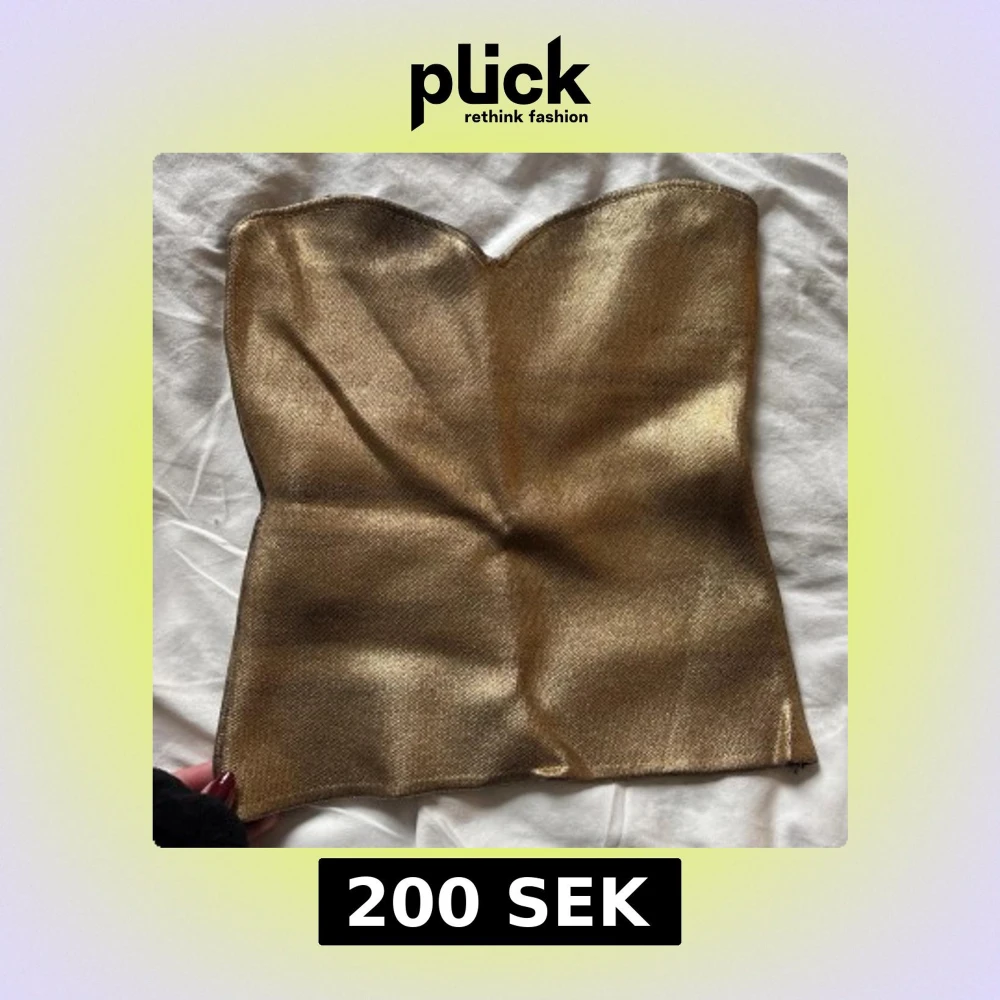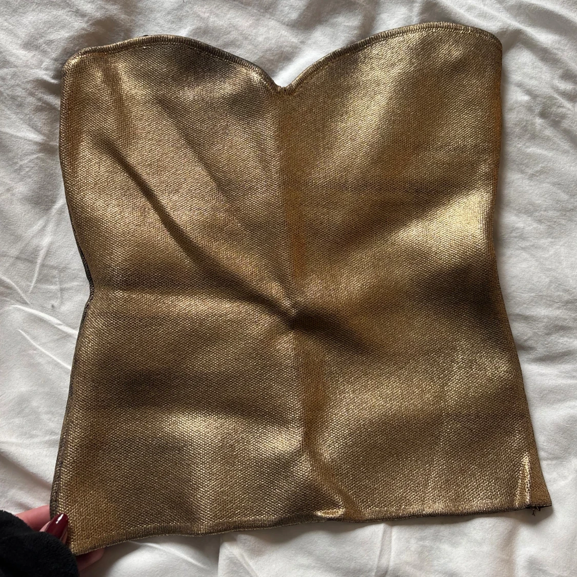 Säljer en snygg guldig tubtopp från Zara i storlek S. Toppen är axelbandslös med en glansig metallic-finish och har en lätt strukturerad yta. Perfekt för att sticka ut med en cool look. Stängs med en diskret dragkedja i sidan. Köpt på här på Plick men i ett fint skick, säljer pågrund ut av för liten på mig💖