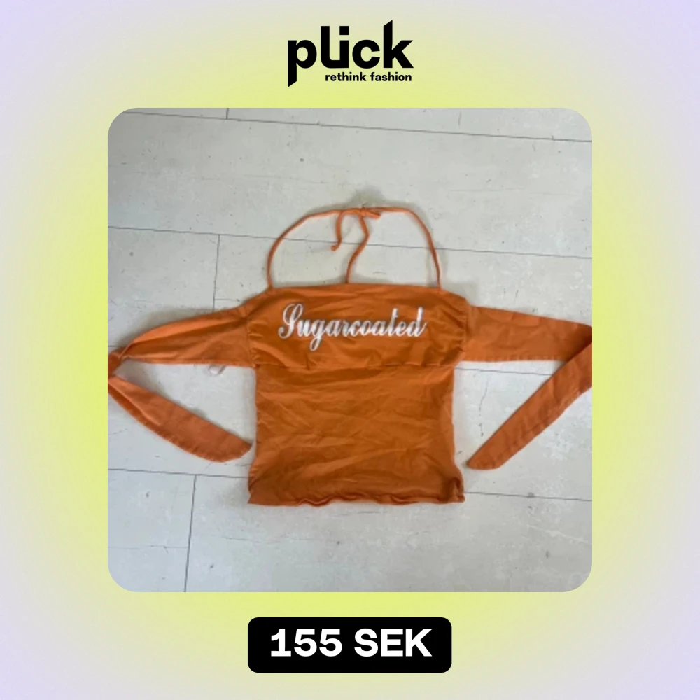 En orange topp från Jennyfer med texten 'Sugarcoated' tryckt på framsidan. Toppen har halterneck och knytband runt ryggen! .