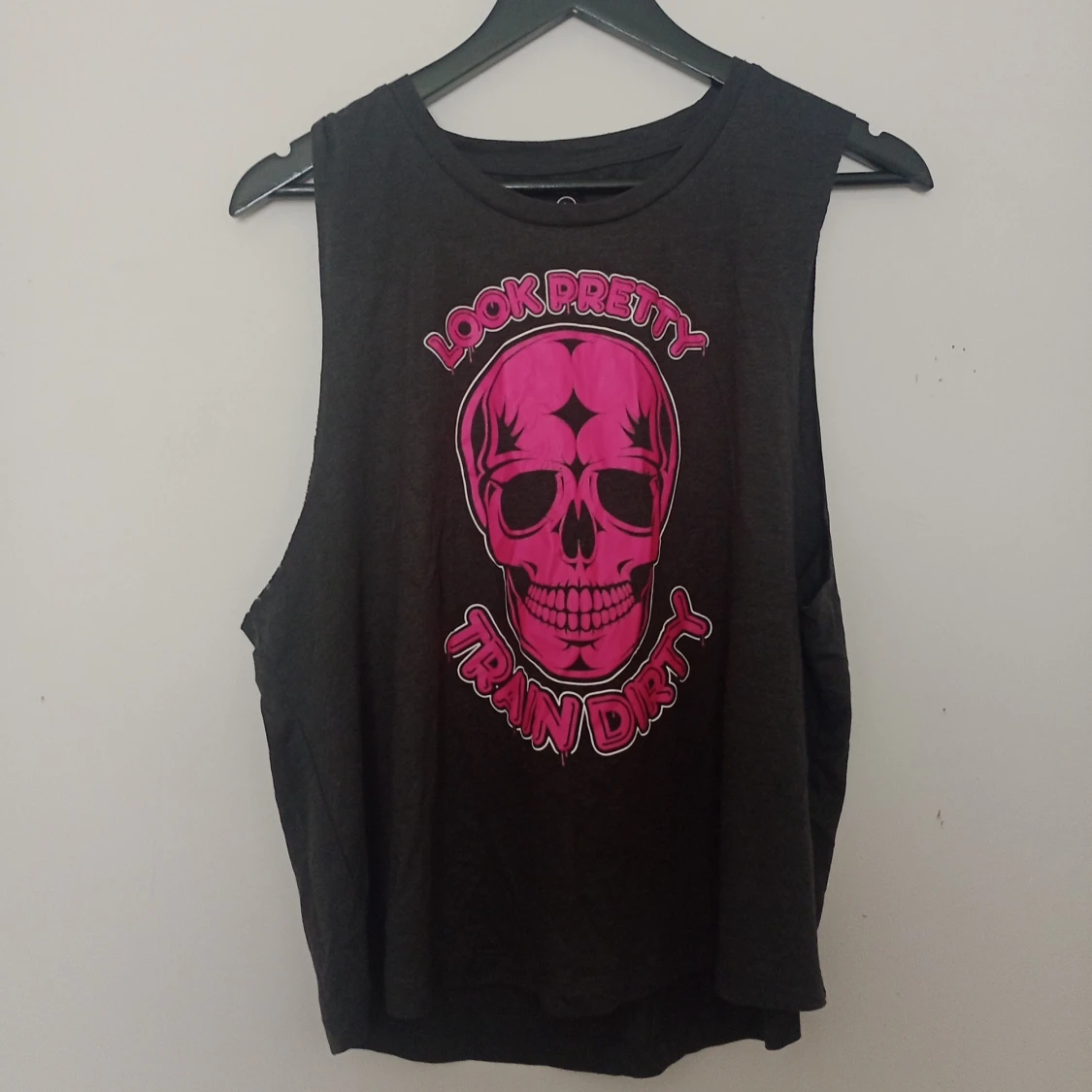 Cool svart ärmlös linnetopp från Northern Spirit med stort rosa döskalle-tryck och texten 'Look Pretty Train Dirty' på framsidan. Tillverkad i en mjuk blandning av polyester och viskos, perfekt för träning eller gym.