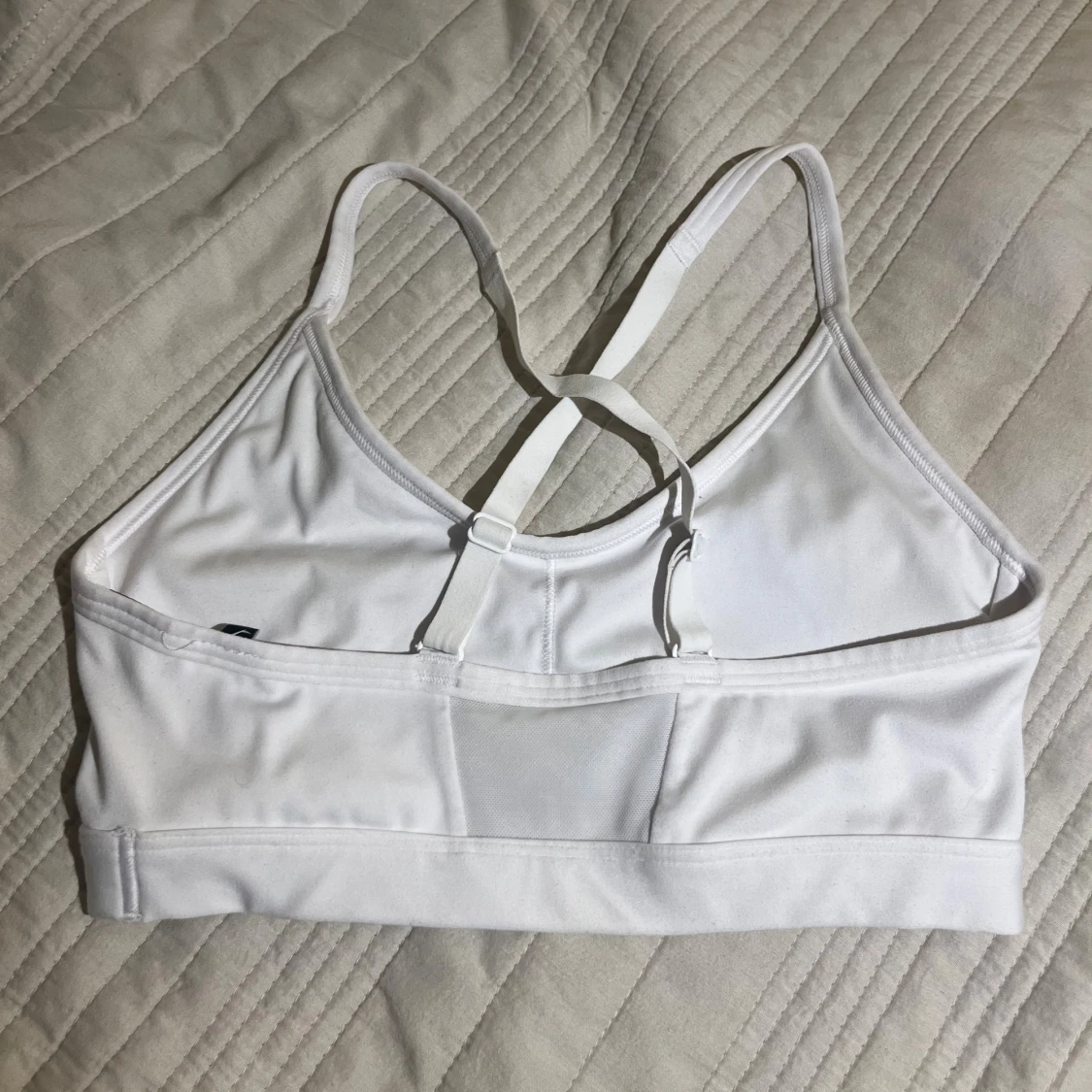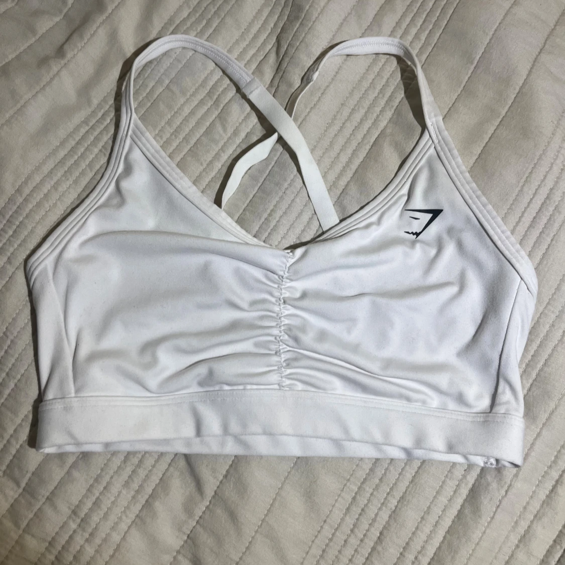Säljer en vit sportbh från Gymshark med smala korsade axelband och snygg rynkdetalj framtill. Toppen har en sportig vibe och är tillverkad i stretchigt syntetmaterial som passar perfekt för träning. Diskret Gymshark-logga på bröstet. Ingen vaddering. Använd ett fåtal gånger 🥰