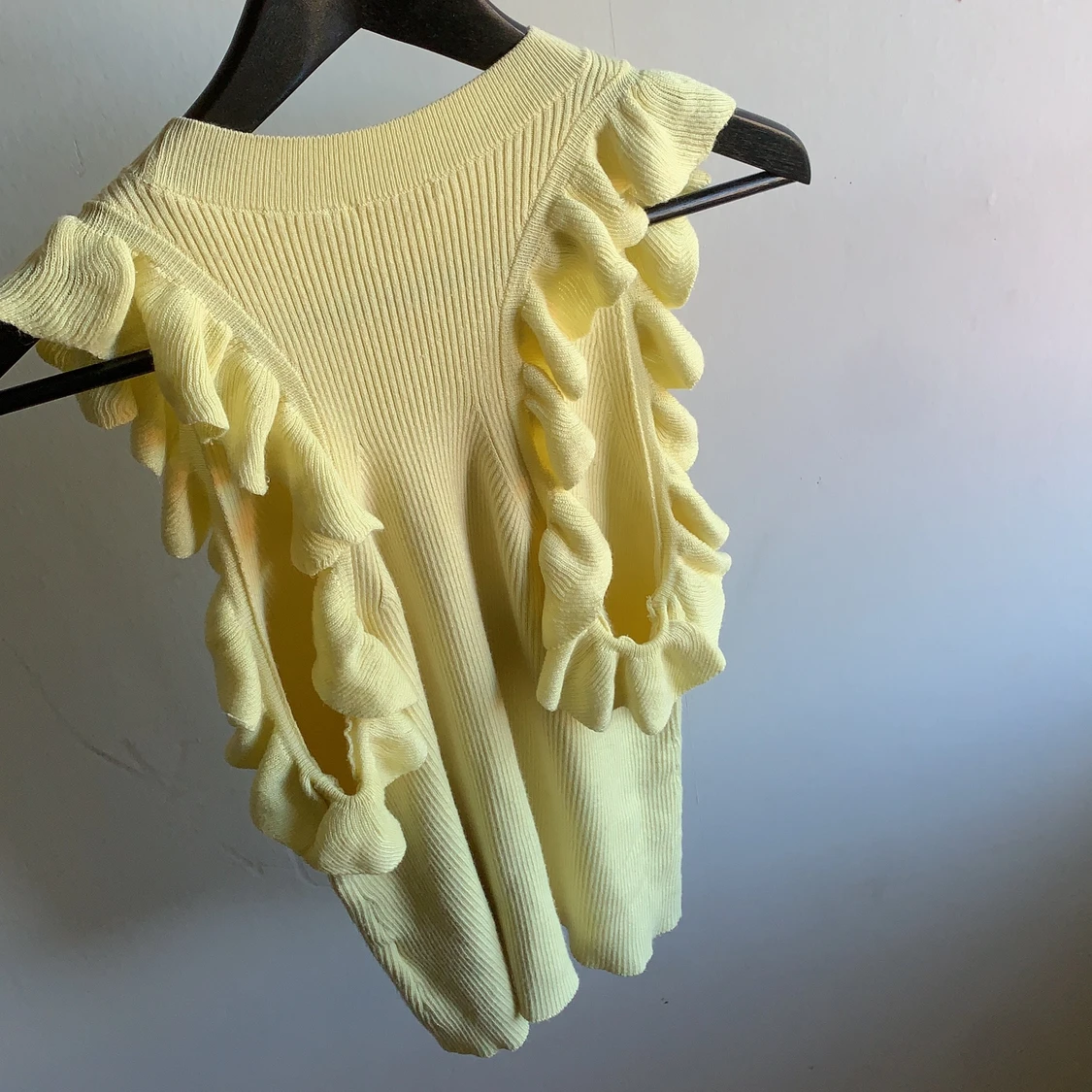 Gul stickad volangtopp med en avslappnad modell.