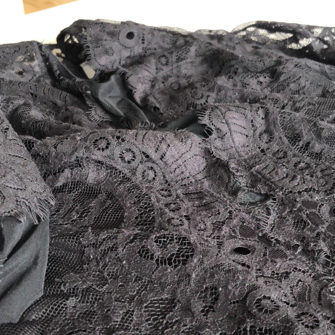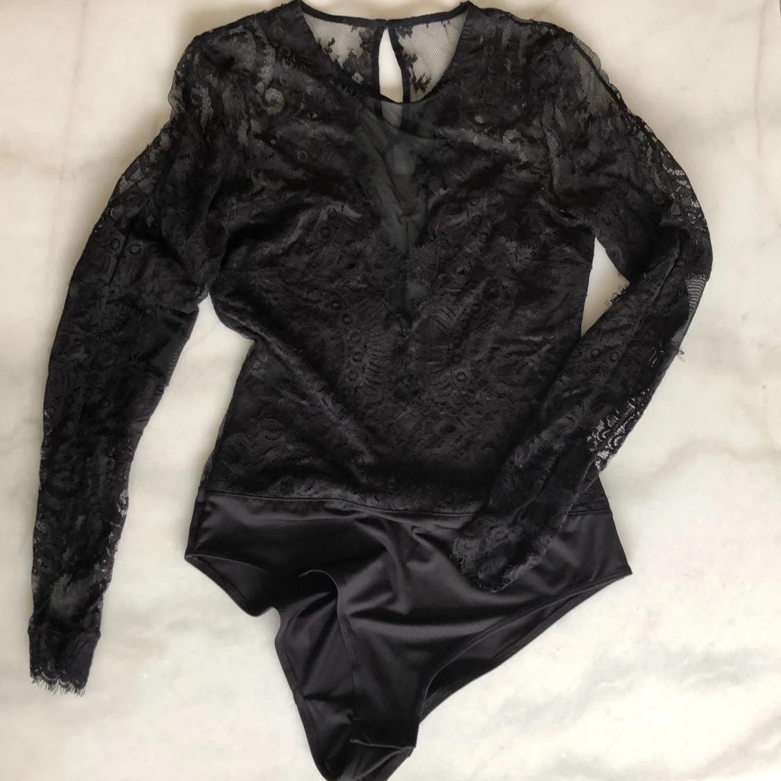 Svart spetsbody från hm. Sparsamt använd men lite nopprig. Meshtyg mellan brösten och knäppning i grenen. Frakten är inräknad i priset.