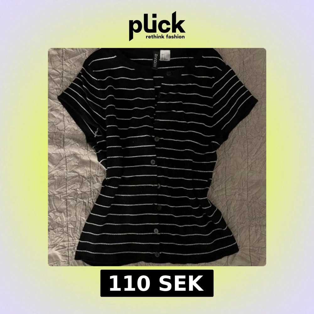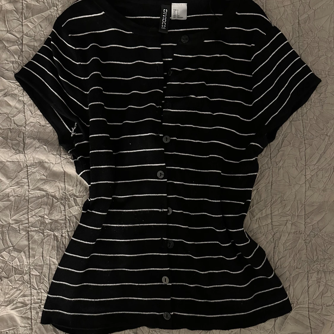 Svart topp från H&M med vita horisontella ränder och knappar hela vägen framtill. Kortärmad och med rund halsringning. Perfekt för en avslappnad och trendig look.