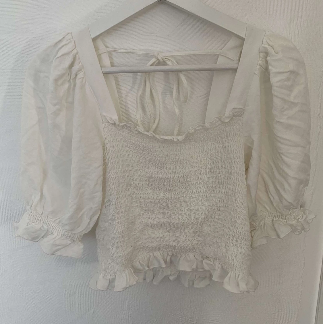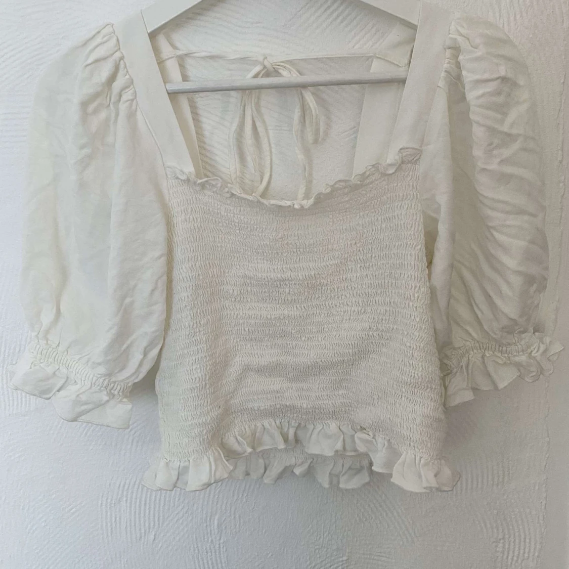 Vit ribbad topp med puffärmar och snöre baktill från H&M i storlek xs, passar även s. Supersöt men är för stor tyvärr.