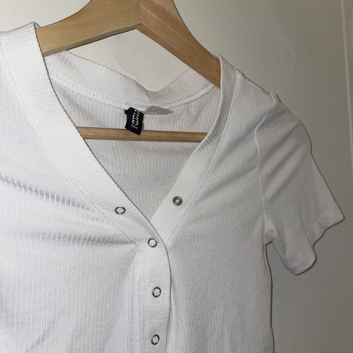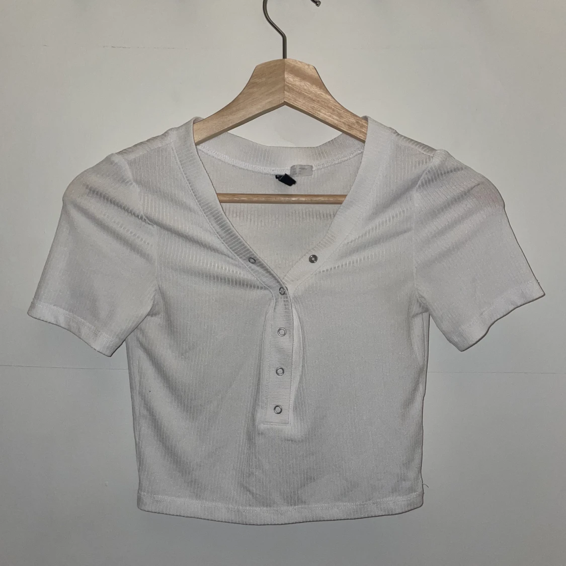 Vit tröja med knappar, alla går att knäppa/knäppa upp. Stretchig och lite lätt genomskinlig. Storlek XS men då den är stretchig skulle jag säga att den passar XS-M.