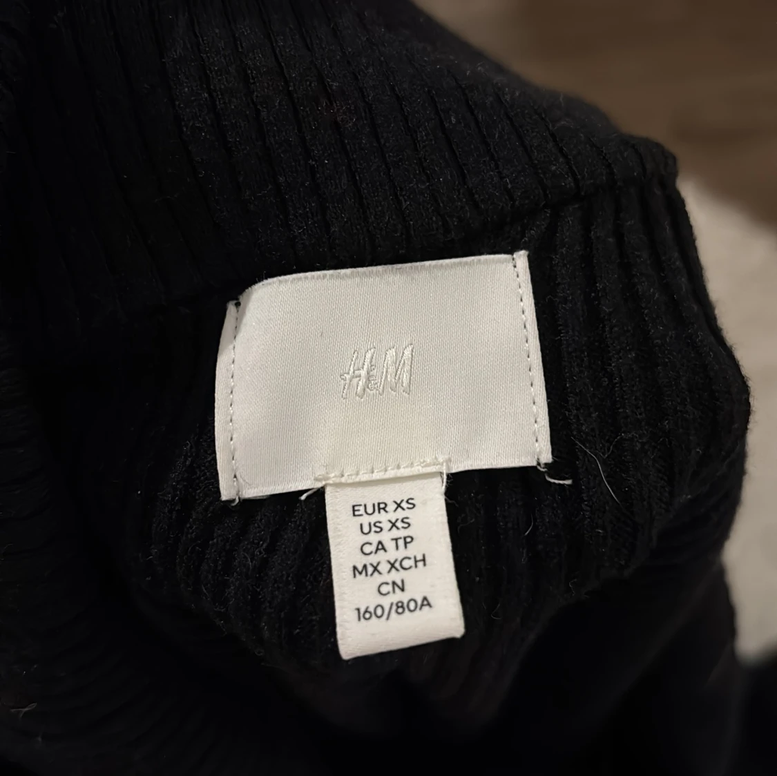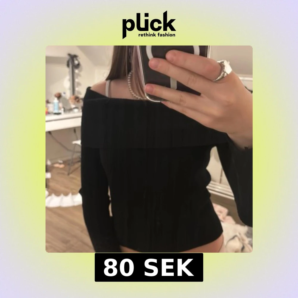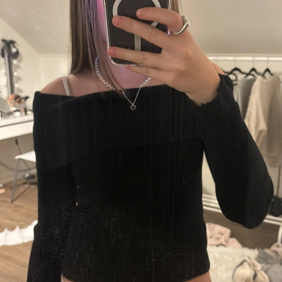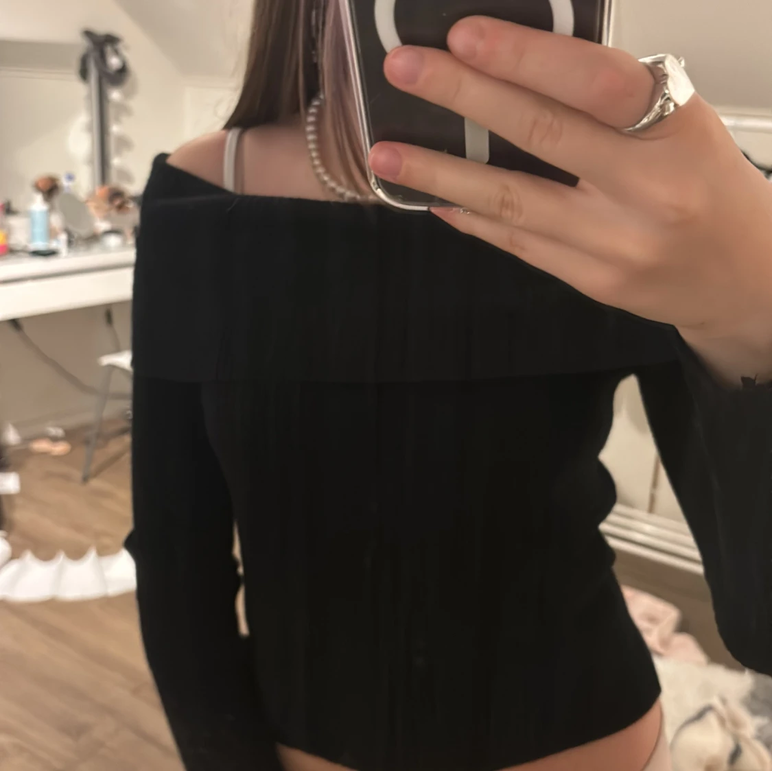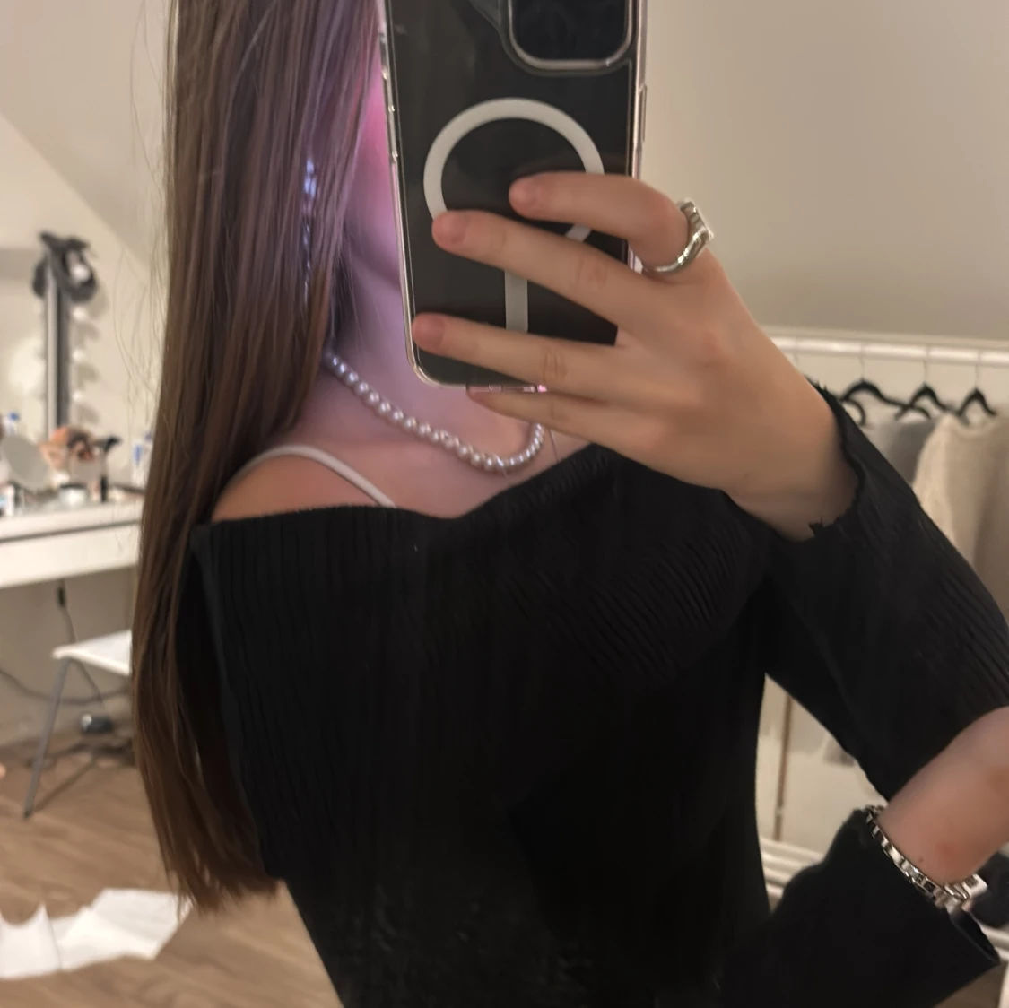 Säljer en svart ribbad offshoulder topp från H&M i storlek XS. Toppen har lång ärm och en bred kant över axlarna som ger en snygg och trendig look. Perfekt att styla med smycken och jeans för en cool outfit. 💖💖