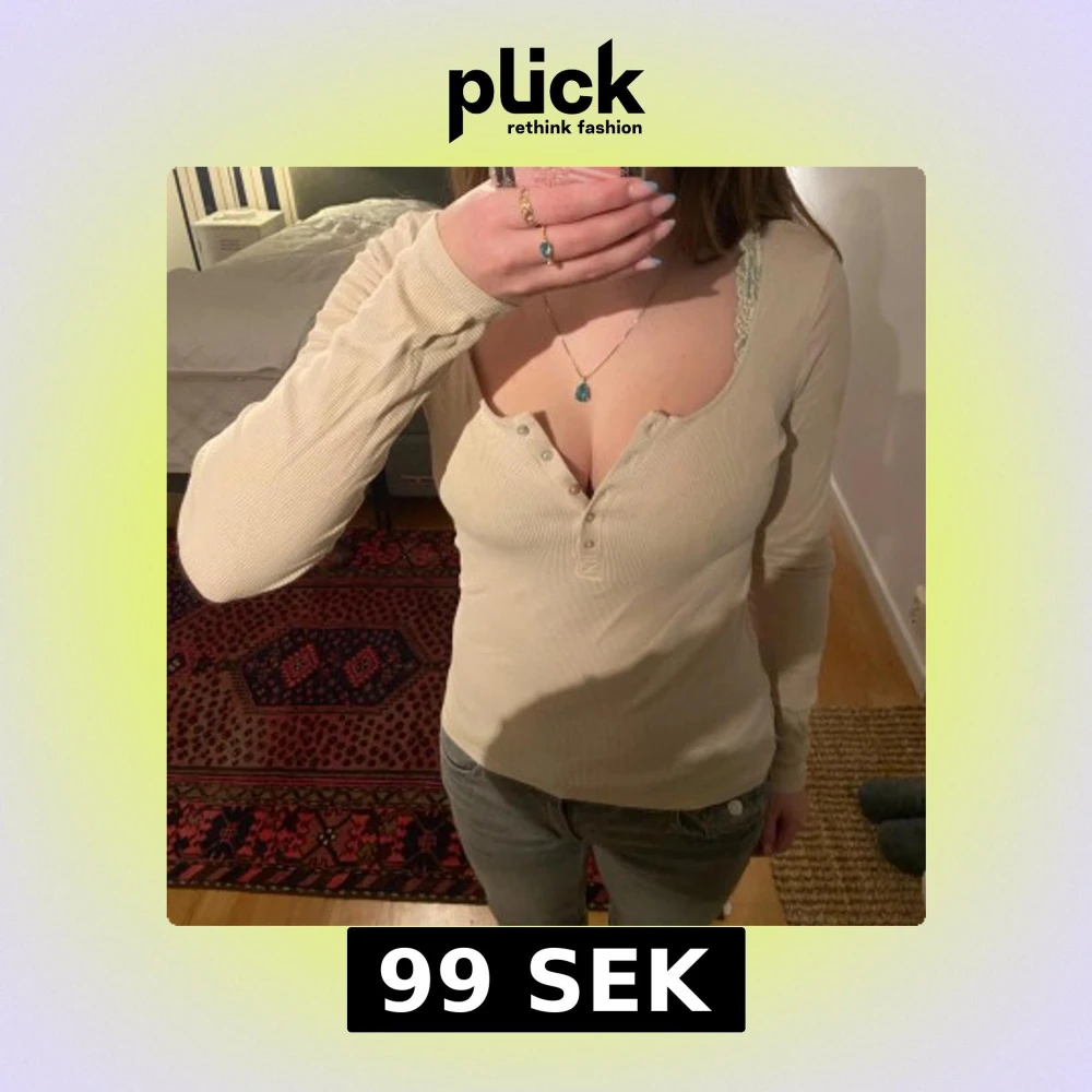 Säljer en beige ribbad topp från H&M med knappar framtill. Toppen har en djup v-ringning och långa ärmar.