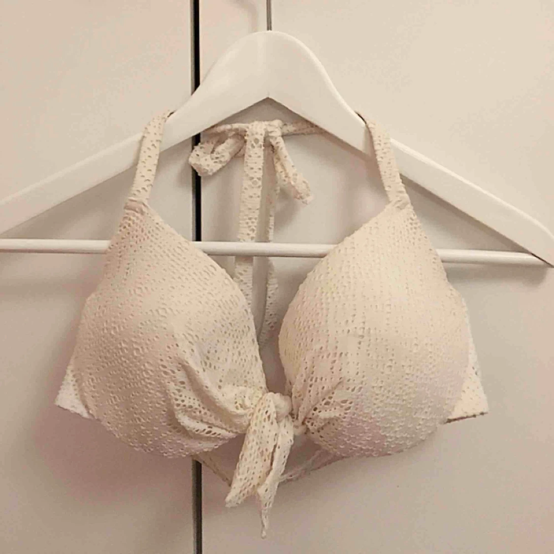 vit bikiniöverdel med knyte i nacken och spänne i ryggen