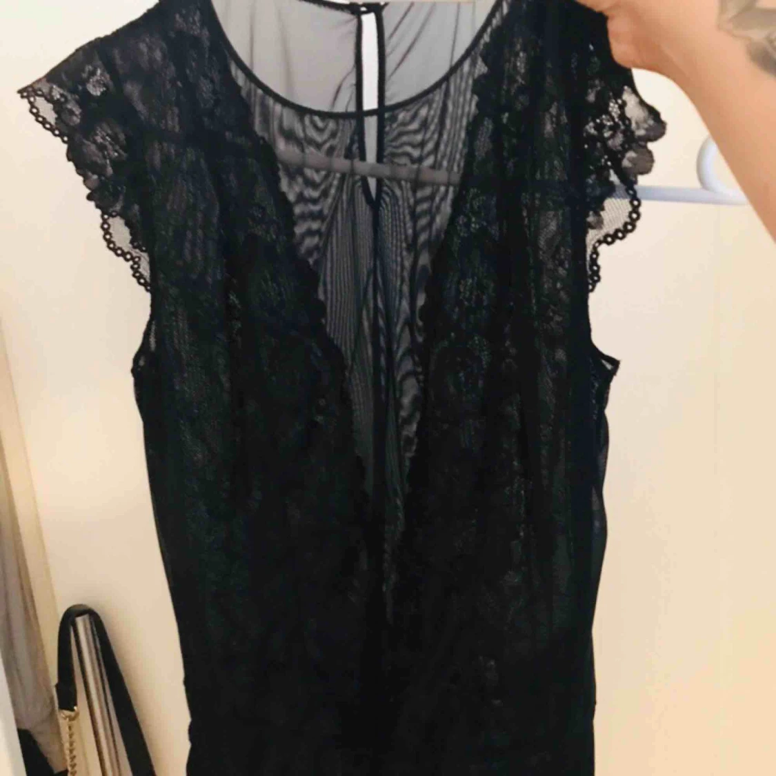 En spetsbody med genomskinlig urringning och genomskinlig i ryggen. Strl L men passar M. Köpare står för frakt eller möts upp.